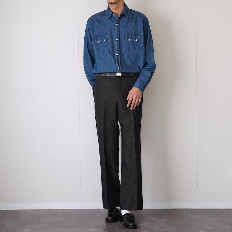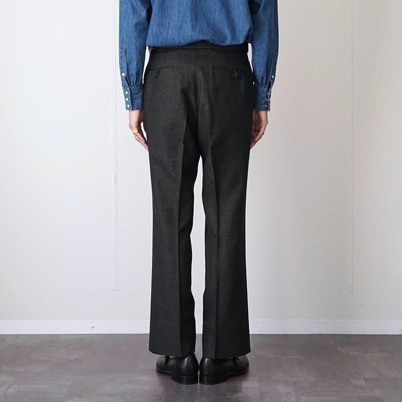 ウール84%・リネン16%で織り上げたツイル生地を使用したフレアトラウザー。 グリーンとオレンジの糸を交互に織り上げることで、落ち着いた色調の中に深みと奥行きを感じさせる表情を生み出しています。ウールのしなやかさとリネンのドライな質感が絶妙に調和し、シーズンを通して快適な穿き心地に仕上がっています。 シルエットは腿まわりに程よくゆとりを持たせ、裾にかけて自然に広がるフレアライン。動きに合わせて生地がしなやかに揺れ、スタイルに上品なリズムを添えます。 緻密なパターンワークによる美しいラインは、MAATEE&SONSらしい構築的なデザインの真骨頂。 クラシックなドレススラックスの仕立てを背景に持ちながらも、素材の質感によって程よくカジュアルにも馴染む一本。 奥行きのある色調と確かな仕立てが、装いに静かな存在感を与えます。 モデル身長184cm 体重64kg 着用サイズ2 SIZE(cm) 1:ウエスト78 股上30 股下76 ワタリ32 裾幅25.5 2:ウエスト80 股上31 股下78 ワタリ34 裾幅26 QUALITY WOOL84% LINEN16% LINING:POLYESTER100%