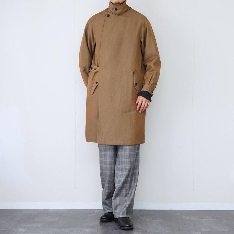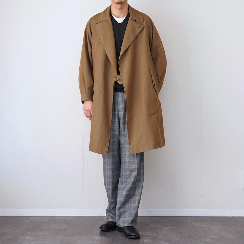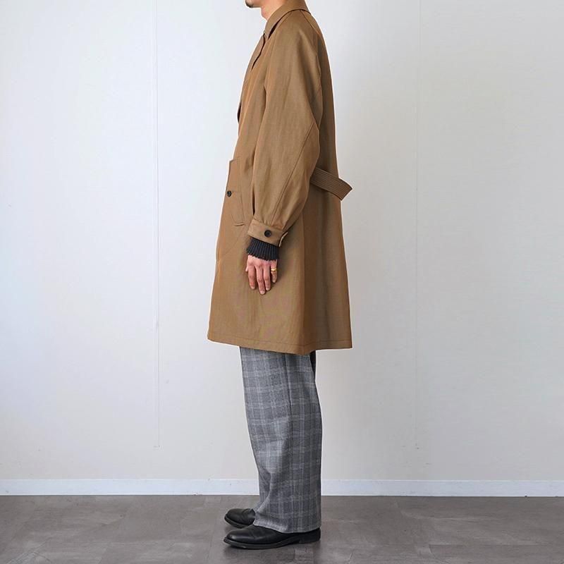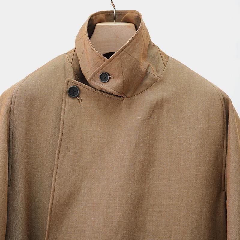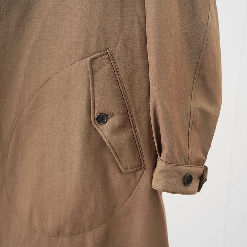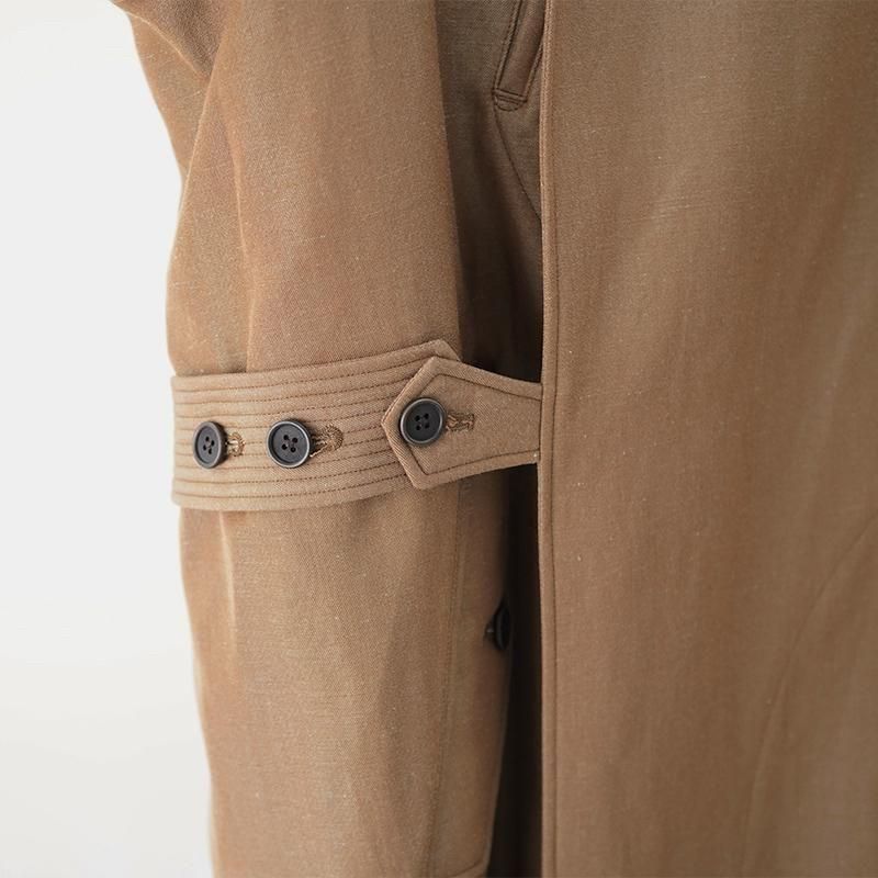 しっとりと落ち着いたカーキベージュのトーンに、ウール×リネン×コットンの混紡素材が持つ2:1ギャバジン特有のハリと品の良い表情。 過度な光沢はなく、天然繊維らしい奥行きと、わずかに残るドライタッチが魅力のアウターです。 フロントの合わせと、ボタンに頼らず包み込むように着られる構造は、タイロッケンコートを思わせるデザイン的ニュアンス。過度に装飾を入れず、ミニマルな佇まいのまMAATEE&SONSらしい現代的なバランスに仕上げられています。 ウエストには段階調整式のサイドタブを備え、シルエットに変化をつけられる仕様。大ぶりに設計されたフラップポケットは、視覚的なアクセントとしてだけでなく、手が自然に入る角度と深さが確保されています。 内側には、ウール88%を使用した着脱式ライナーを搭載。秋から冬、そして春先まで3シーズンで楽しんで頂けます。 モデル身長184cm 体重64kg 着用サイズ1 SIZE(cm) 1:着丈106 身幅63 裄丈86 2:着丈109 身幅65 裄丈86 QUALITY WOOL67% LINEN18% COTTON15% BODY LINING:COTTON70% POLYESTER30% SLEEVE LINING:RAYON57% COTTON43% PADDING:POLYESTER100% LINER:WOOL88% NYLON10% ANOTHER2% ANOTHER FABRIC:RAYON57% COTTON43%