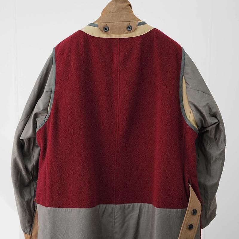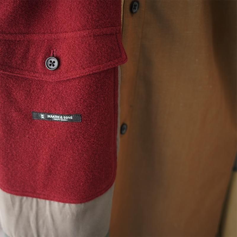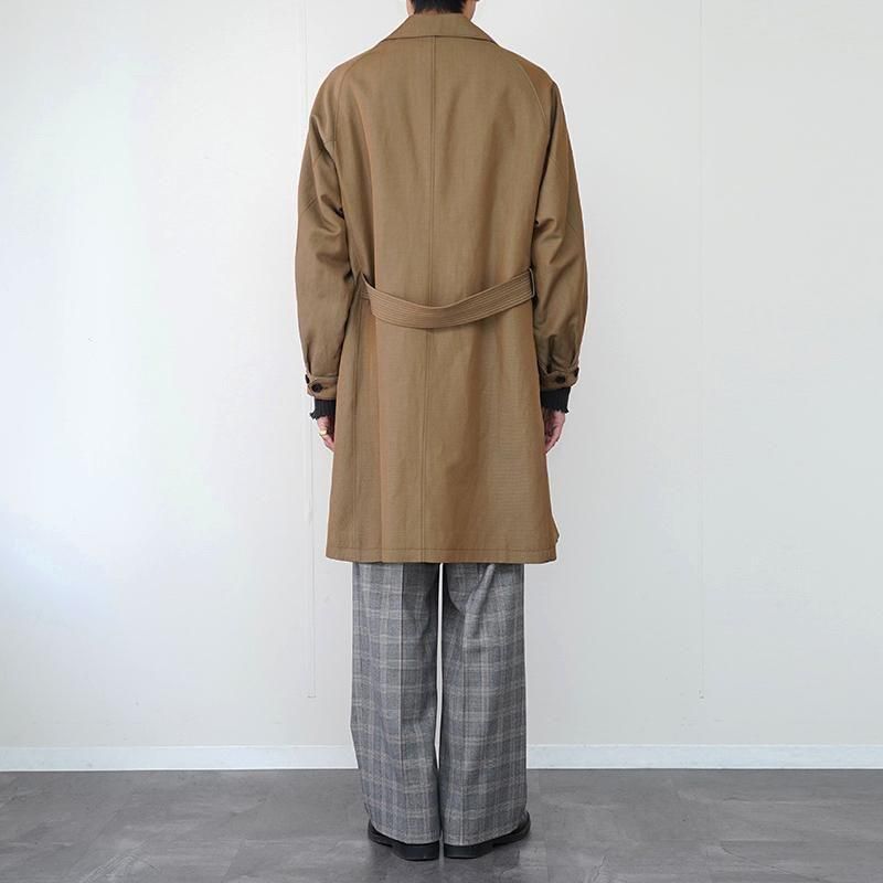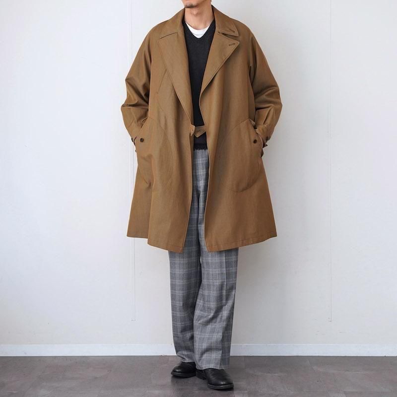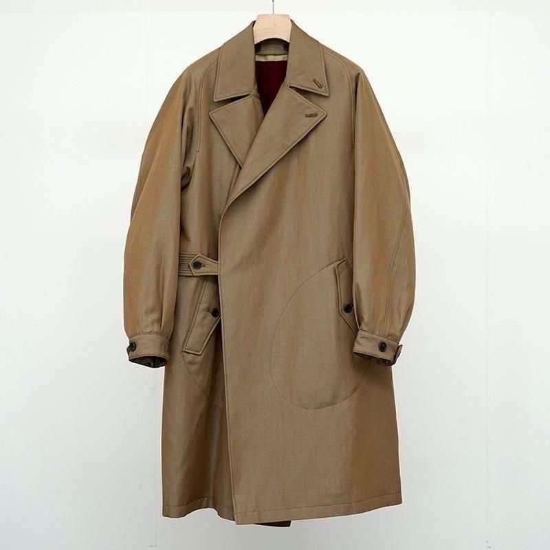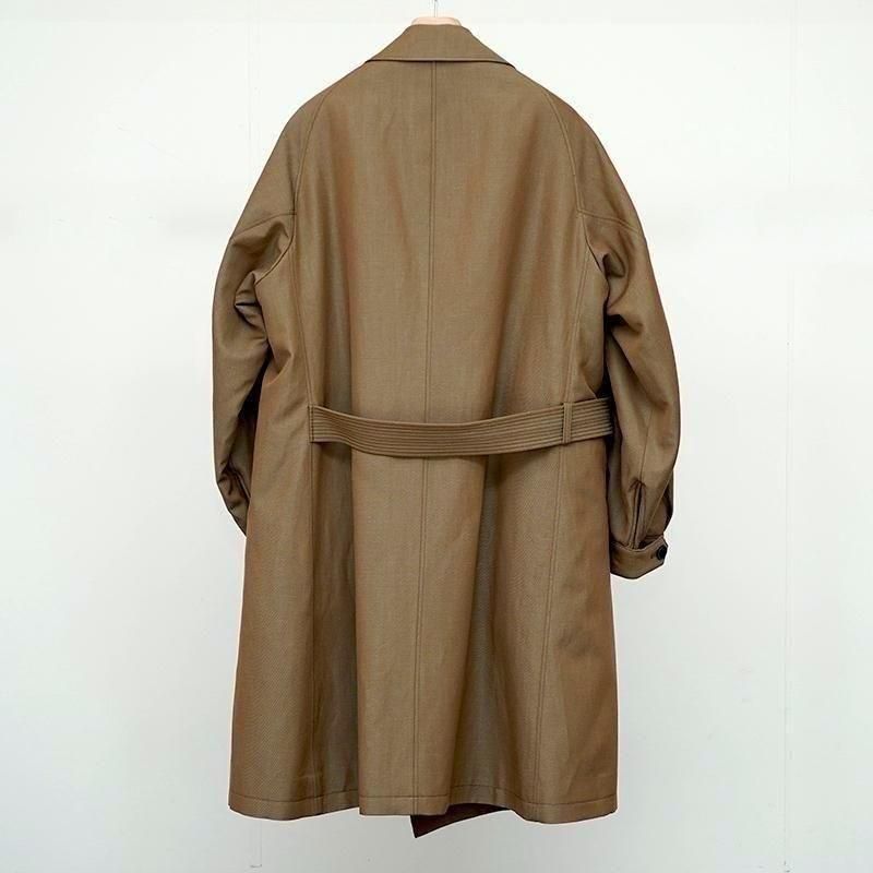 しっとりと落ち着いたカーキベージュのトーンに、ウール×リネン×コットンの混紡素材が持つ2:1ギャバジン特有のハリと品の良い表情。 過度な光沢はなく、天然繊維らしい奥行きと、わずかに残るドライタッチが魅力のアウターです。 フロントの合わせと、ボタンに頼らず包み込むように着られる構造は、タイロッケンコートを思わせるデザイン的ニュアンス。過度に装飾を入れず、ミニマルな佇まいのまMAATEE&SONSらしい現代的なバランスに仕上げられています。 ウエストには段階調整式のサイドタブを備え、シルエットに変化をつけられる仕様。大ぶりに設計されたフラップポケットは、視覚的なアクセントとしてだけでなく、手が自然に入る角度と深さが確保されています。 内側には、ウール88%を使用した着脱式ライナーを搭載。秋から冬、そして春先まで3シーズンで楽しんで頂けます。 モデル身長184cm 体重64kg 着用サイズ1 SIZE(cm) 1:着丈106 身幅63 裄丈86 2:着丈109 身幅65 裄丈86 QUALITY WOOL67% LINEN18% COTTON15% BODY LINING:COTTON70% POLYESTER30% SLEEVE LINING:RAYON57% COTTON43% PADDING:POLYESTER100% LINER:WOOL88% NYLON10% ANOTHER2% ANOTHER FABRIC:RAYON57% COTTON43%