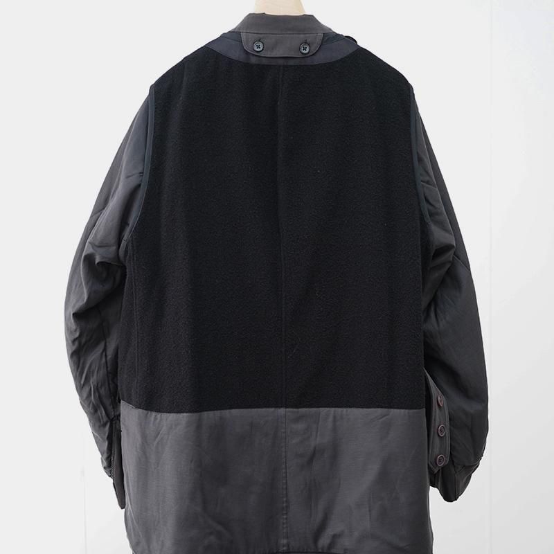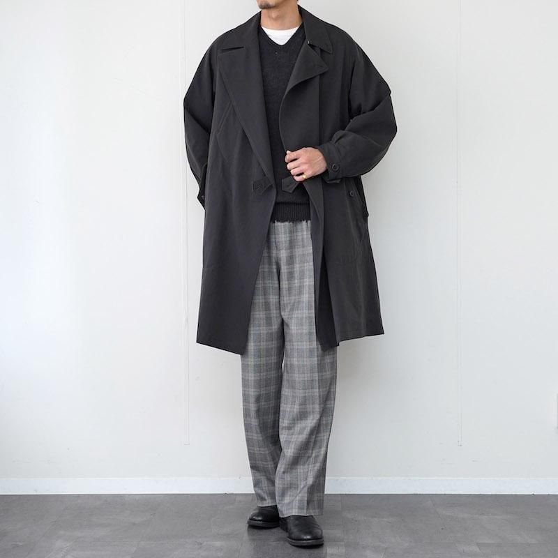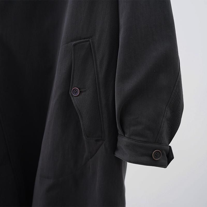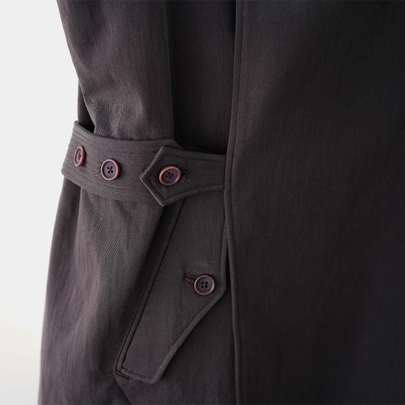 コットン100%のシャンブレー生地を使用したOVER COATです。 軽さのある綿素材ならではの柔らかなドレープ感と、光の角度でわずかに表情を変えるマットな艶が特徴です。 フロントの合わせと、ボタンに頼らず包み込むように着られる構造は、タイロッケンコートを思わせるデザイン的ニュアンス。過度に装飾を入れず、ミニマルな佇まいのまMAATEE&SONSらしい現代的なバランスに仕上げられています。 ウエストには段階調整式のサイドタブを備え、シルエットに変化をつけられる仕様。大ぶりに設計されたフラップポケットは、視覚的なアクセントとしてだけでなく、手が自然に入る角度と深さが確保されています。 内側には、ウール88%を使用した着脱式ライナーを搭載。ナイロン混で耐久性を持たせつつ、しっかりとした保温性を備えています。 秋から冬、そして春先まで3シーズンで楽しんで頂ける仕様となっております。 モデル身長184cm 体重64kg 着用サイズ1 SIZE(cm) 1:着丈107 身幅64 裄丈86 2:着丈108 身幅65 裄丈87 3:着丈110 身幅67 裄丈88 QUALITY COTTON100% BODY LINING:COTTON70% POLYESTER30% SLEEVE LINING:RAYON57% COTTON43% PADDING:POLYESTER100% LINER:WOOL88% NYLON10% ANOTHER2% ANOTHER FABRIC:RAYON57% COTTON43%