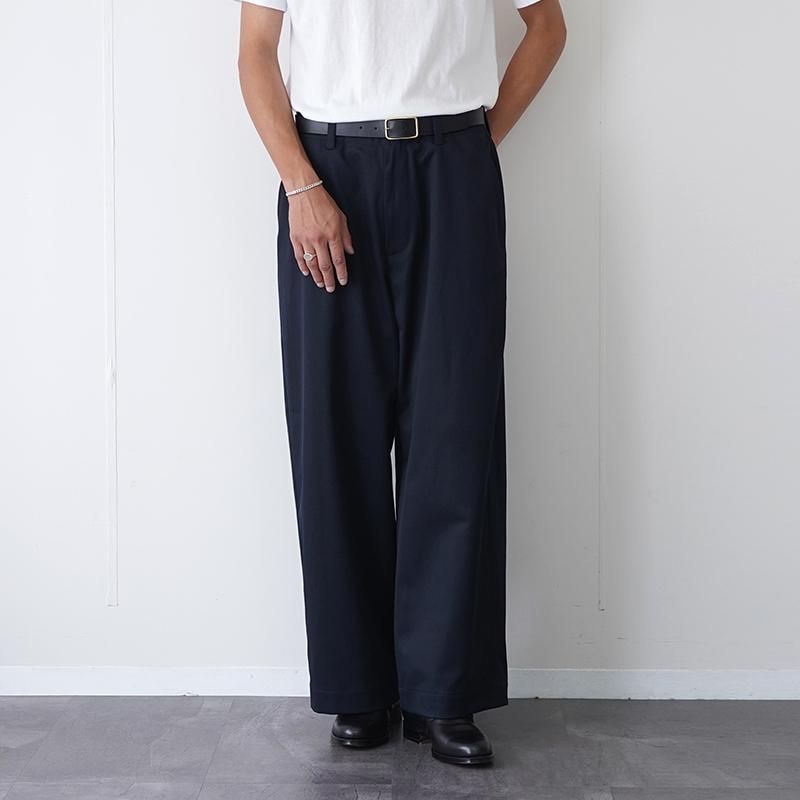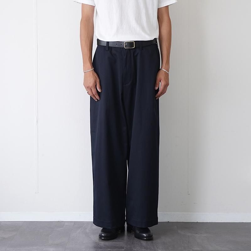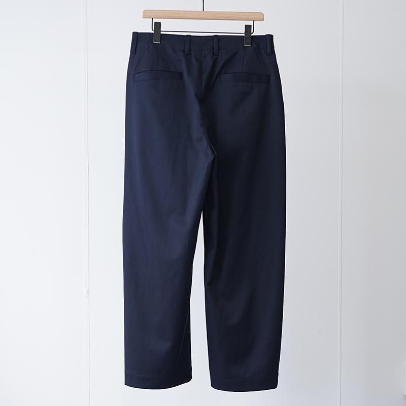 USAコットンとウールポリエステルの糸を使用したドレス仕様のチノクロス地を使用。シワになりづらく、ウォッシャブル可能です。 タックを入れておらず、太めのデザイン。リラックスした雰囲気でストンと落ちるシルエットです。 長い季節着用しやすい一本です。 モデル身長184cm 体重64kg 着用サイズ3 SIZE(cm) 1:ウエスト79 股上33 股下69 ワタリ34 裾幅29 2:ウエスト82 股上33 股下71 ワタリ35 裾幅29.5 3:ウエスト84 股上34 股下73 ワタリ37 裾幅30 QUALITY POLYESTER44% COTTON35% WOOL19% POLYURETANE2%