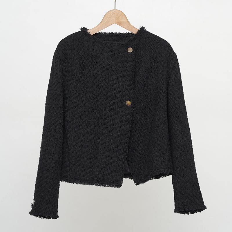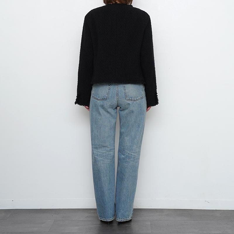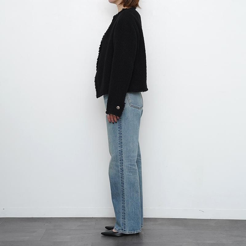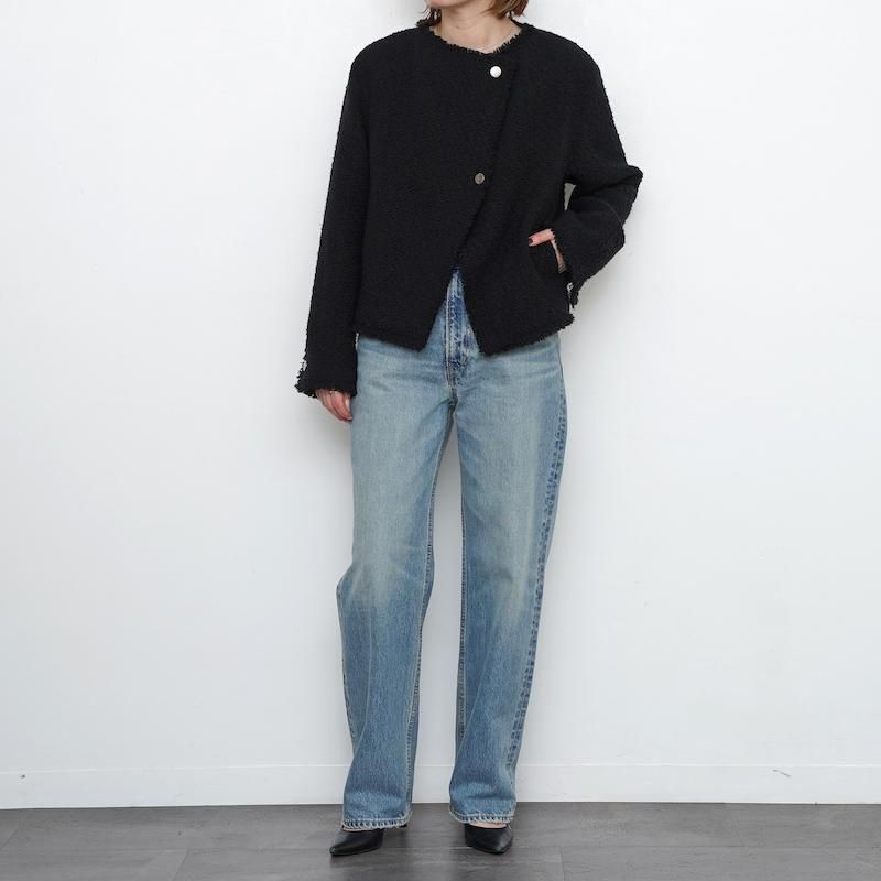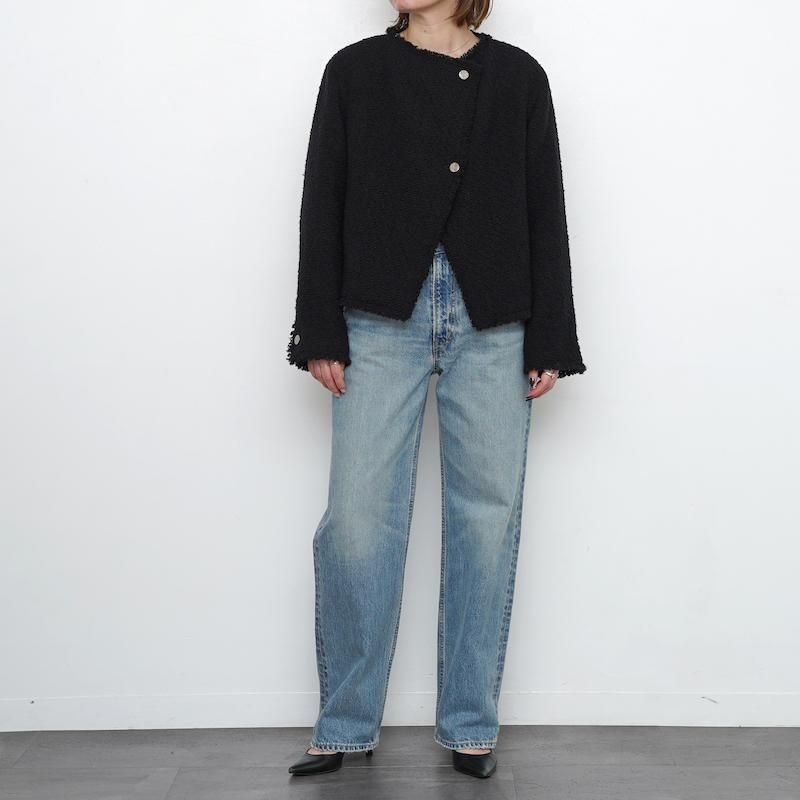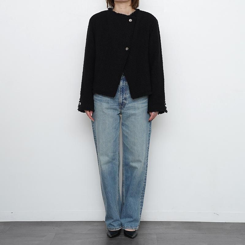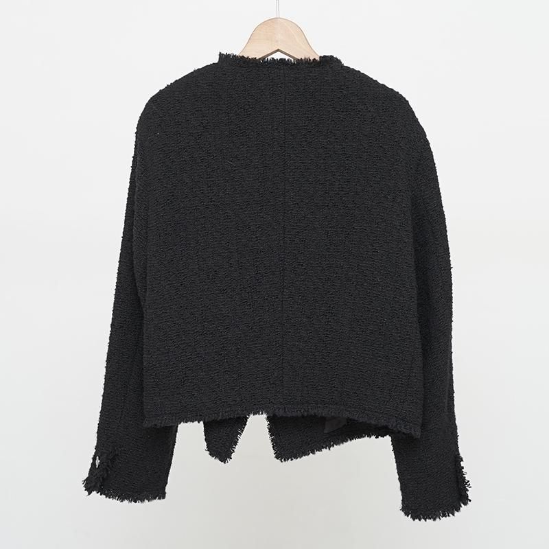 イタリアのプラトーのメーカーで、経糸にウール糸、緯糸にウール、ナイロン、シルク糸でざっく織りあげた糸味を生かした素材です。フリンジワークが効いたフォルムジャケット。 モデル身長155cm 着用サイズ1 SIZE(cm) 0:着丈53 肩幅44 身幅50 袖丈55 QUALITY WOOL61% NYLON30% SILK8% OTHER1%