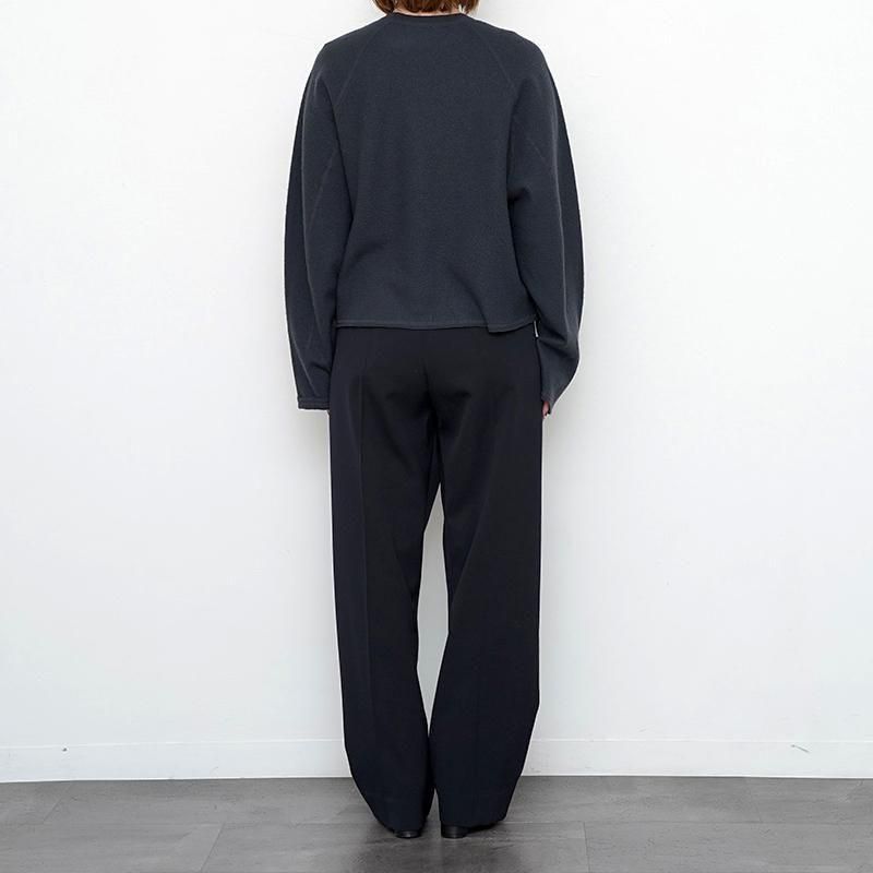 17.5μのオーストラリア産極細メリノウールを強縮絨させてカットソーの様に作った素材。裏毛トレーナーのようなステッチワークとフォルムをのせたニットプルオーバーです。