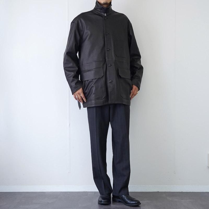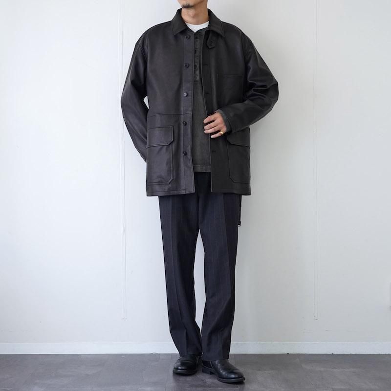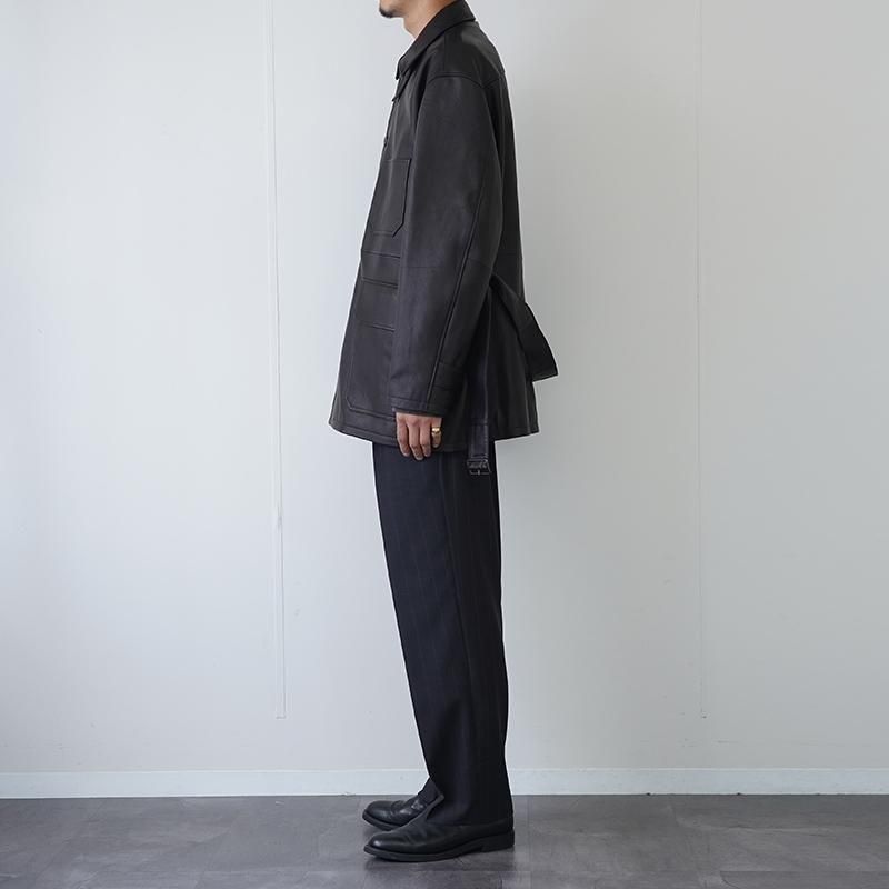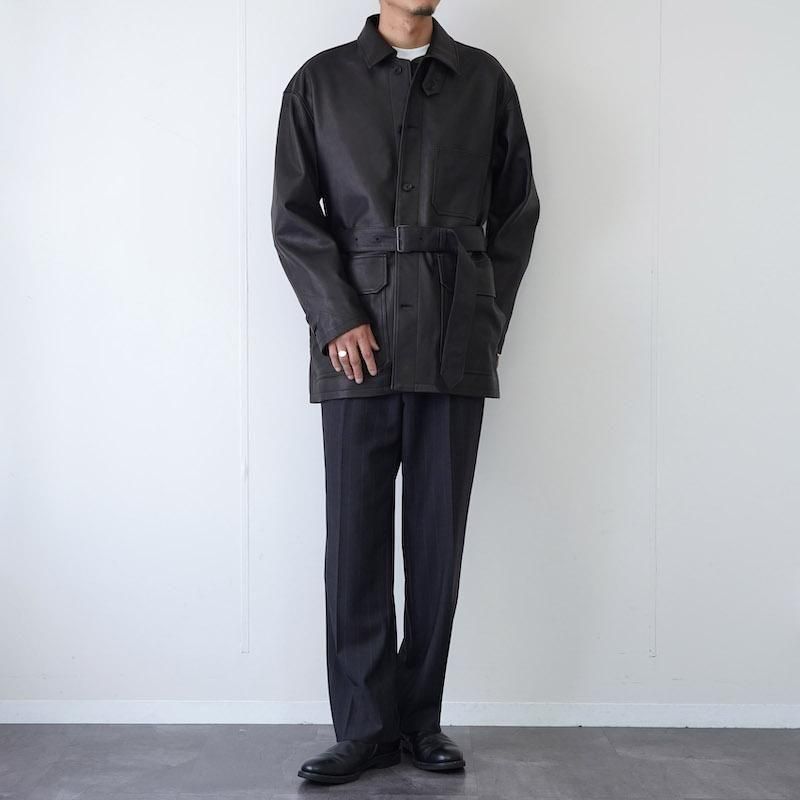 染料による染色で色付けで赤みのブラックを表現。表面に顔料を使用しない、天然革本来のシボ感とエイジングを楽しめる革で絹ヅレのような音が特徴の皮です。カバーオールのベルトを付けたデザインで、ハーフコートの様な着方が出来るとても軽いアウターです。 襟元にはチンストラップを備え、ミニマルなデザインに抑えながらも機能的なアクセントをプラス。 前立てはボタン開閉、胸にはパッチポケット、そして腰回りにはフラップ付きのポケットやベルトループがあしらわれ、付属の着脱式ピンバックルベルトでシルエットの調整も自在です。 また、ドロップショルダーとカフスのボタンタブにより、リラックス感のある着こなしも可能。内側には便利なウェルトポケットも備え、裏地はキュプラのライニングで仕立てられています。 日常の装いにレザーならではの深みと緩やかな構築美を添えたい方にこそ手に取っていただきたい一着。シンプルながら計算されたディテール、機能性と美意識が溶け合ったYLEVEらしいレザージャケットです。 モデル身長184cm 体重64kg 着用サイズ4 SIZE(cm) 3:着丈81 肩幅56 身幅64 袖丈60 4:着丈83 肩幅58 身幅66 袖丈62 QUALITY SHEEP LEATHER