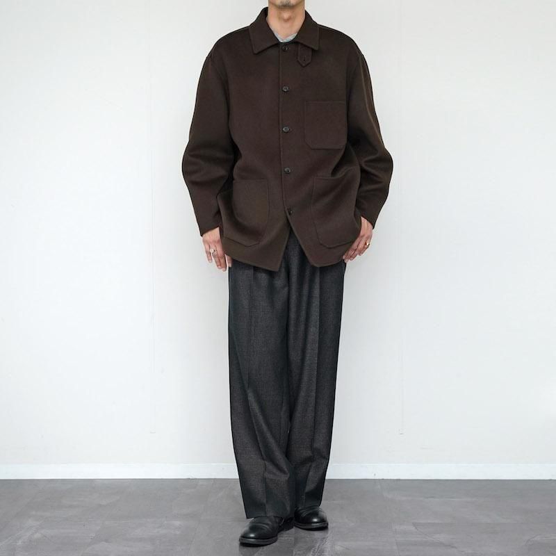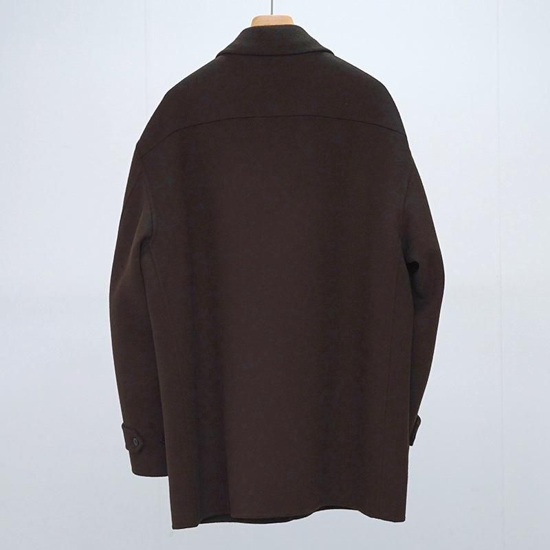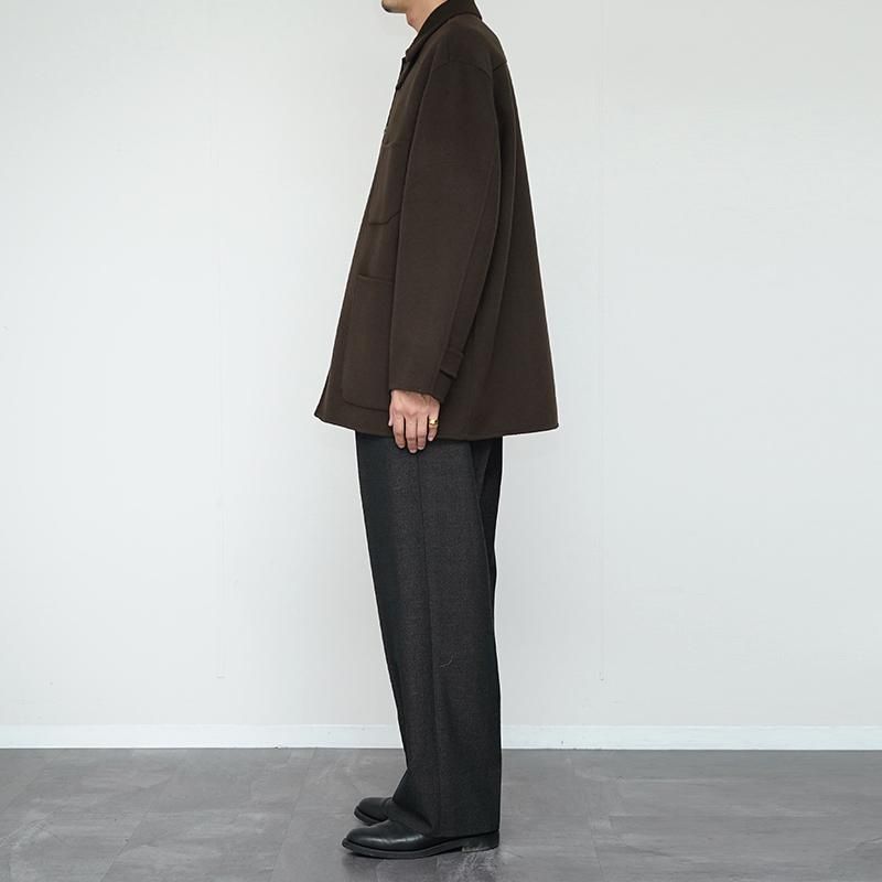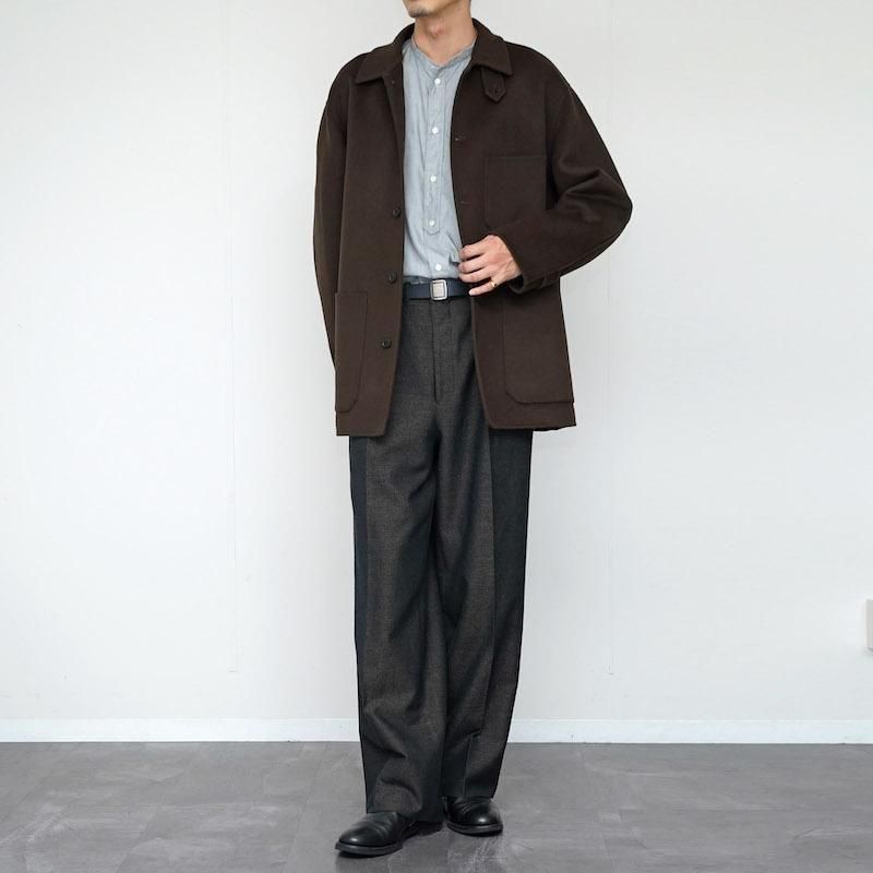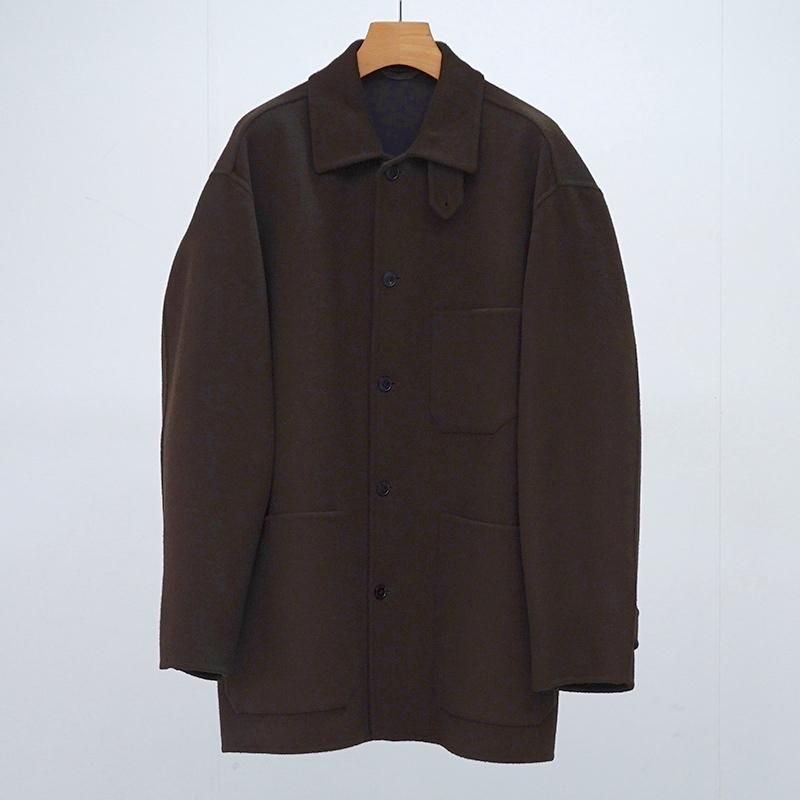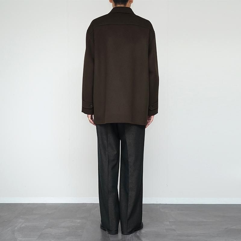 1/16 Super100s原料を使い、ダブルフェイスにて織り上げた素材になります。しなやかなながらも打ち込みを多くしてはりこしを持たせた素材です。リバー仕立てのカバーオールデザイン。ハーフコートの様な着方が出来るとても軽いアウターです。 厚みのある上質なメルトン生地は、滑らかで重厚感のあるタッチが魅力です。しっかりとした生地感ながら、羽織ると驚くほど柔らかく身体に馴染み、シルエットの美しさを一層際立たせます。 胸元や腰の大きめのポケットがデザインポイントとなり、実用性と装飾性を両立。ややゆとりを持たせたシルエットは、インナーにニットやジャケットを合わせても余裕があり、秋冬のスタイリングを力強く支えてくれる一着です。 シンプルでありながら存在感のあるデザインは、カジュアルからドレスまで幅広いコーディネートに対応します。 モデル身長184cm 体重64kg 着用サイズ4 SIZE(cm) 3:着丈80.5 肩幅53 身幅64 袖丈58 4:着丈83 肩幅55 身幅66 袖丈60 QUALITY WOOL100% LINING:CUPRO100%