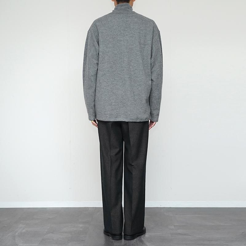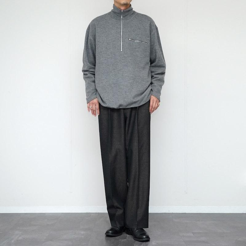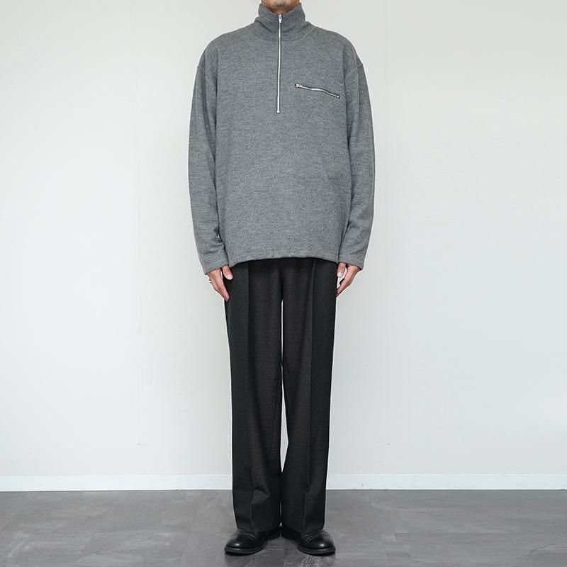 17.5μのオーストラリア産極細メリノウールを強縮絨させてカットソーの様に作った素材。カットソー感覚で着れる肌あたりの良いハーフジップデザイン。ジップの明け具合でレイヤードを楽しめます。 フェルトのような起毛感を引き出したハーフジップニットは、ふんわりとしたタッチと適度な厚みがあり、肌に優しく馴染みながらしっかりと温もりを与えてくれます。 柔らかな質感と包み込むような着心地は、デイリーに着たくなる心地よさです。 肩を落としたリラックスシルエットと、ジップの開け閉めで変化する首元の表情が、シンプルな装いに抜け感と旬なニュアンスをプラス。Tシャツとのレイヤードやアウターのインナーとしても合わせやすく、幅広いスタイルに対応します。 モデル身長184cm 体重64kg 着用サイズ5 SIZE(cm) 4:着丈71 肩幅55 身幅60 袖丈61 5:着丈76.5 肩幅58 身幅66 袖丈62 QUALITY WOOL 100%