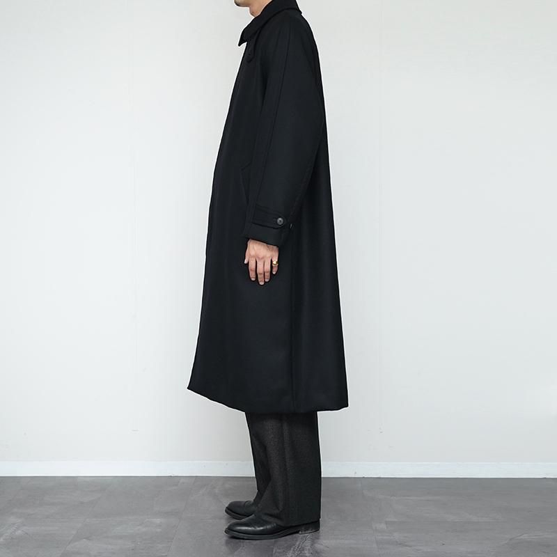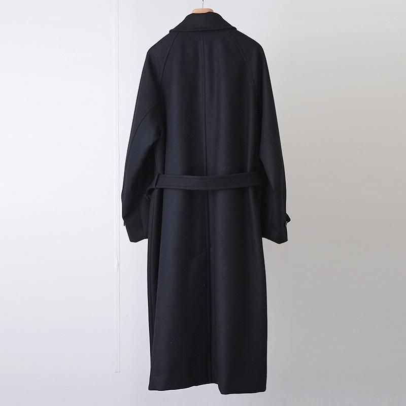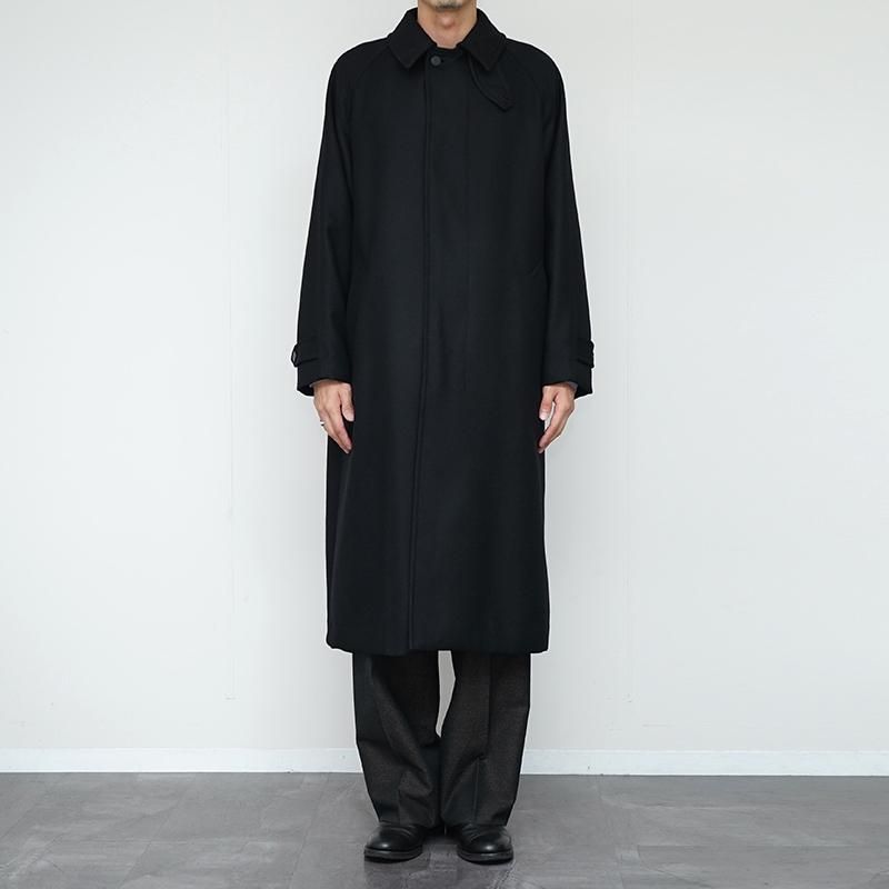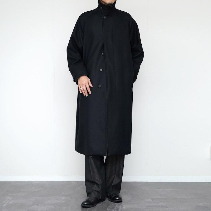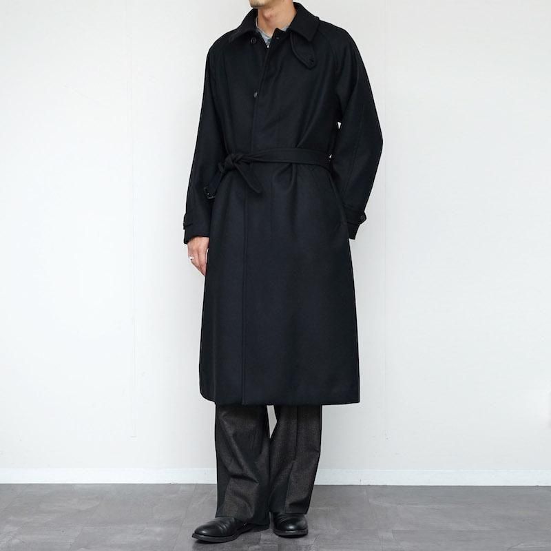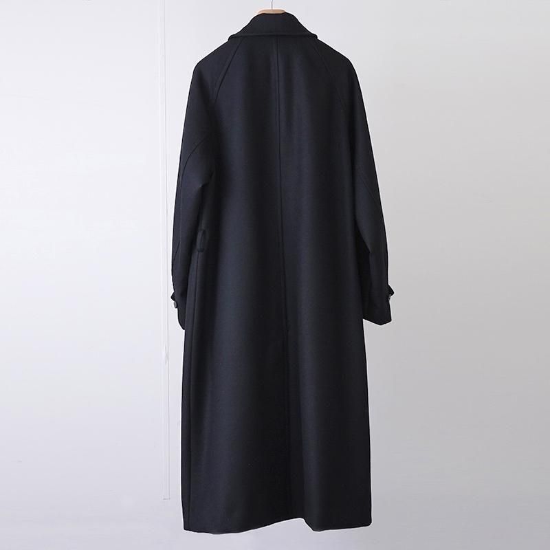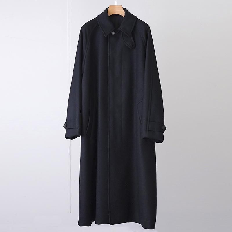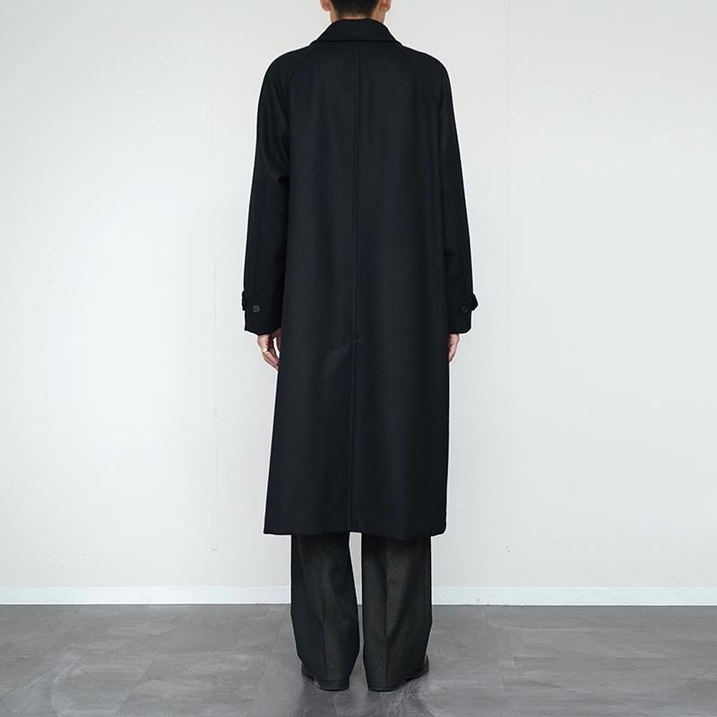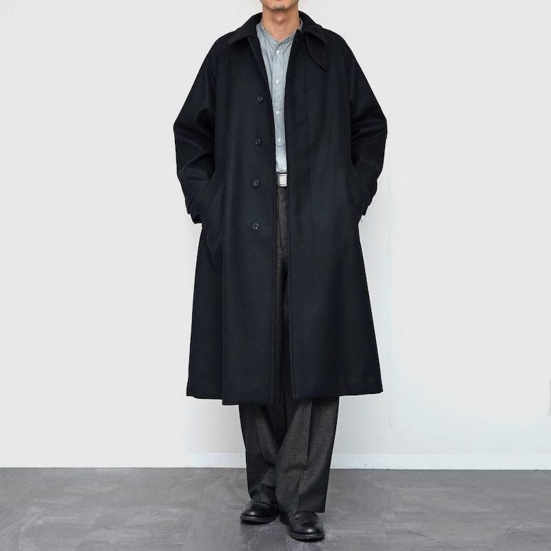 SUPER100'S原料を使い高密度に織り上げた梳毛ダブルクロスです。厚みを抑え高密度に織り、抗ピリング加工を行っています。チンタブ付きのゆったりしたロングコートです。 クラシックとモダンが融合したブランドらしい端正な佇まいが際立つ仕上がりに。 厳選されたウールを100%使用したメルトン素材は、しっかりとした厚みと滑らかな手触りを兼ね備え、上質な重厚感を漂わせます。保温性に優れつつも柔らかく身体に馴染むため、冬のアウターとして長く愛用いただける一着です。 シンプルな比翼仕立てのフロントは、無駄を削ぎ落としたミニマルな表情を演出。ややゆとりを持たせたシルエットは、スーツやジャケットの上から羽織ることもでき、ビジネスからカジュアルまで幅広く対応します。 裾へ向かって自然に落ちる美しいラインが、着る人の佇まいをより洗練されたものに引き上げます。 モデル身長184cm 体重64kg 着用サイズ4 SIZE(cm) 3:着丈121 身幅61 裄丈85 4:着丈123 身幅65 裄丈88 QUALITY WOOL100% LINING:RAYON54% COTTON46% PART:COTTON100%
