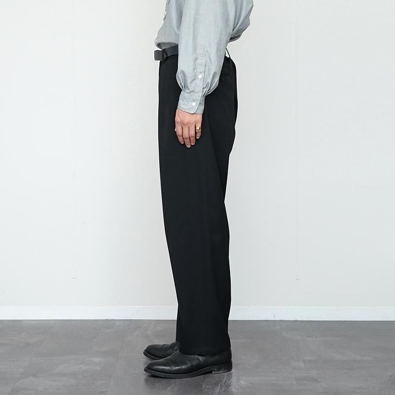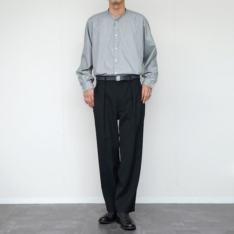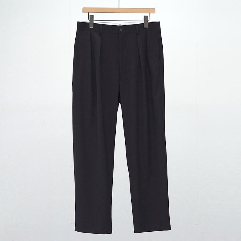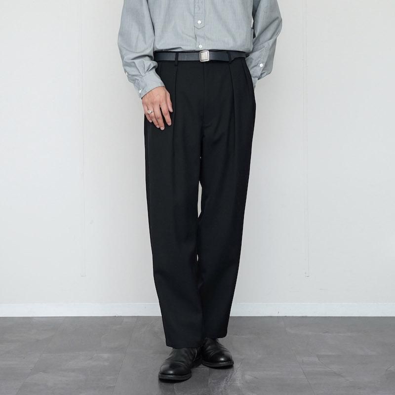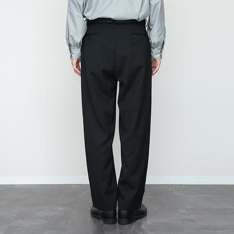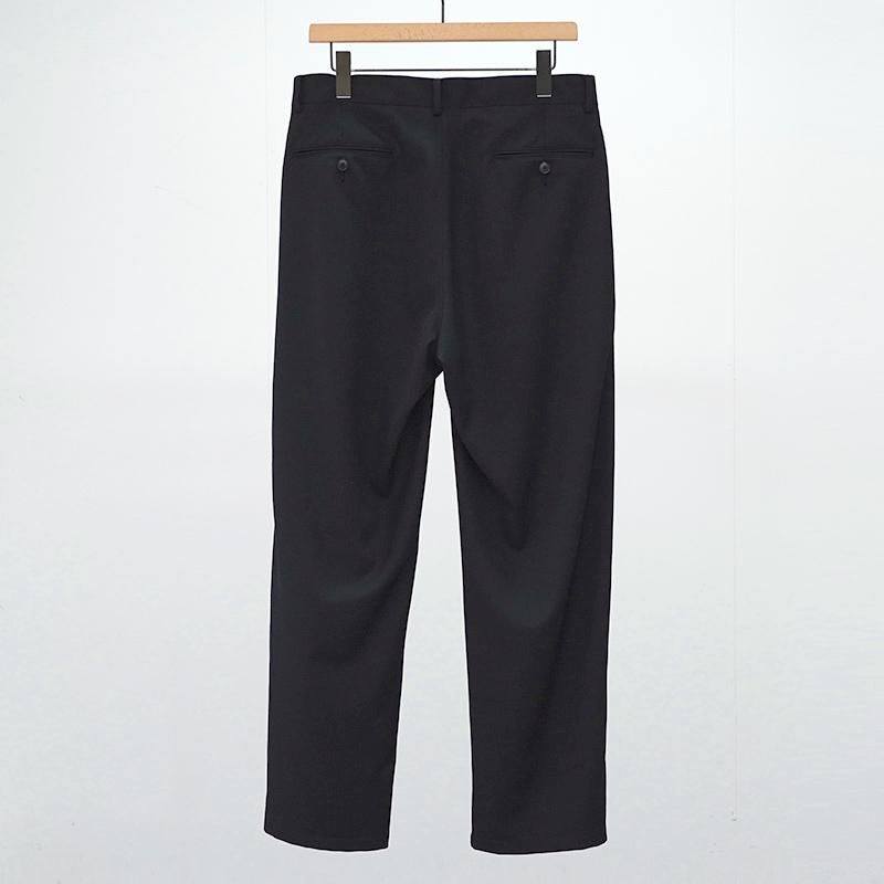 梳毛ウールのツイルを加工によって張り感ある風合いに仕上げています。ストレートシルエットの2タックトラウザーです。 腰回りのリラックス感と足元のすっきりとしたラインが絶妙なバランスを生み出し、モダンで洗練された印象を与えます。 マットな質感としなやかな落ち感を持つ上質なウール生地を使用しており、動くたびに美しいドレープを描きます。 シンプルな表情ながら、立体的なパターンワークと計算されたシルエットによって、スタイリングに奥行きをプラス。幅広く活躍してくれる一本です。 モデル身長184cm 体重64kg 着用サイズ3 SIZE(cm) 3:ウエスト82 股上32 股下72 ワタリ33 裾幅21.5 4:ウエスト86 股上33 股下72 ワタリ31 裾幅22 QUALITY WOOL100% PART:COTTON100%