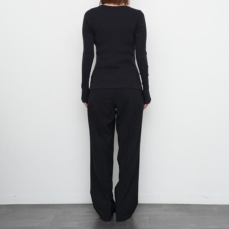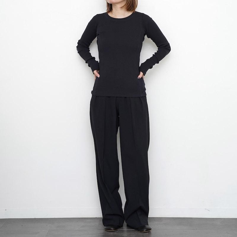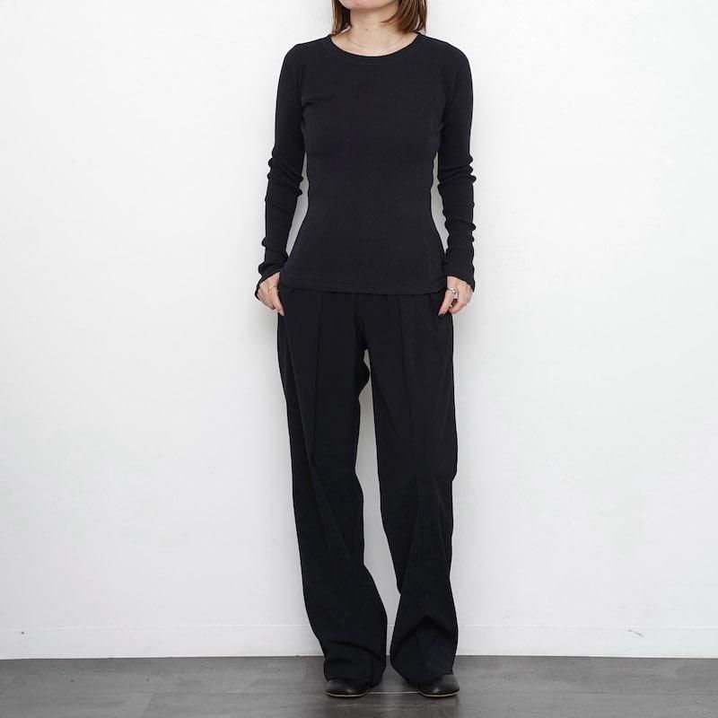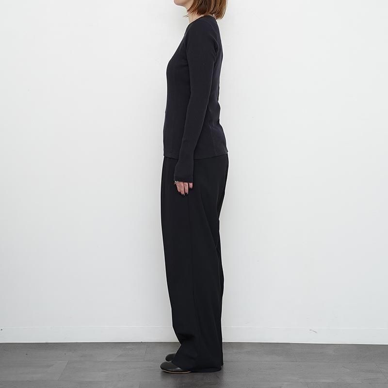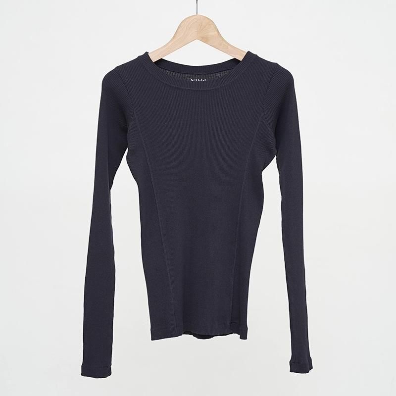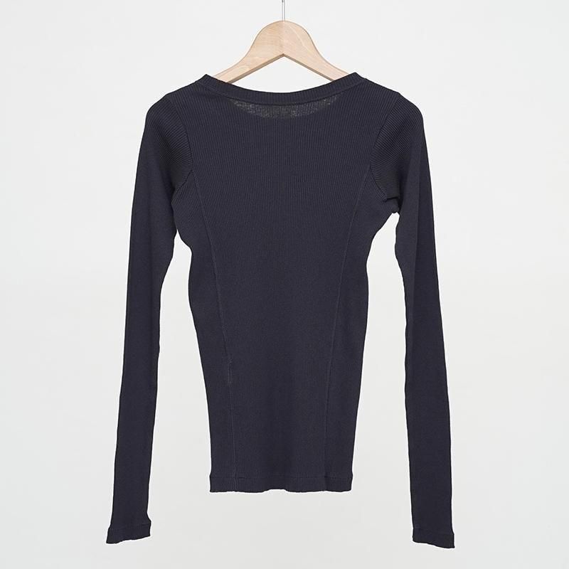 インドのOGコットンを使用した別注糸を使用したリブ素材。あえてムラ感のある表情に仕上げている。デザインは衿明きが大きめの長袖プルオーバー。ニットの下にも重ねて着ていただきたいアイテム。RedはGrayの上から染色して赤でも少し濁ったような色味を表現。 モデル身長155cm 着用サイズ0 SIZE(cm) 0:着丈57.5 肩幅28 身幅29 袖丈63 QUALITY COTTON100%
