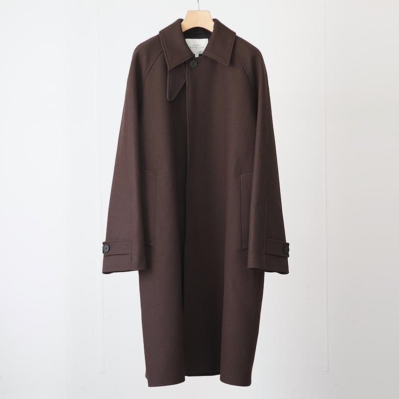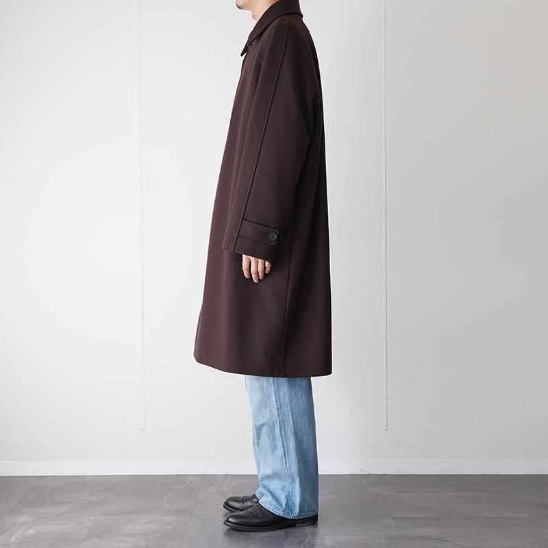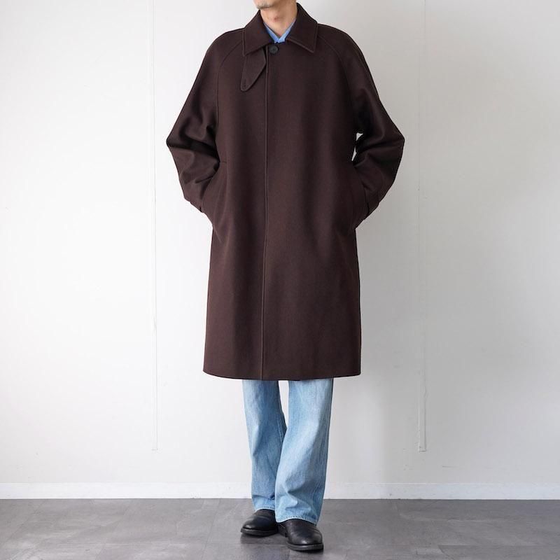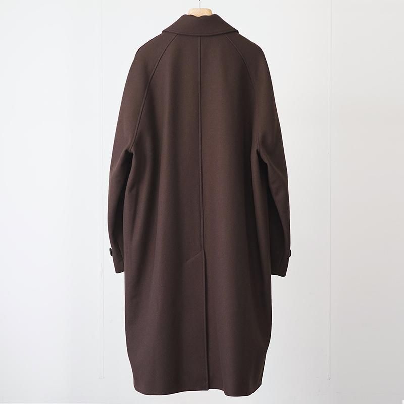 高密度に織り上げ、丁寧に縮絨されたメルトン生地は、重量感と柔らかさを兼ね備え、秋冬シーズンにふさわしい豊かな温もりを提供します。 ラグランスリーブによる肩の自然な落ち感と、ゆとりを持たせたシルエットが、Studio Nicholson特有の洗練されたボリューム感を生み出しています。 フロントは比翼仕立てのミニマルな表情に。 背面には深めのセンターベントを配し、動きやすさと優雅なドレープを演出します。 優しいメルトンウールが醸し出す深みのあるエスプレッソブラウンと、穏やかな気品と知的な印象を生み出すダークネイビーの2色展開。 滑らかな質感が際立ち、コーディネートに上質な奥行きを加えてくれます。 端正でありながらも日常に馴染む、studio nicholsonらしい1着に仕上がっています。 モデル身長184cm 体重64kg 着用サイズS SIZE(cm) XS:着丈112 身幅70 裄丈88 S:着丈115 身幅72 裄丈92 QUALITY WOOL80% NYLON20% LINING:RAYON51% COTTON49%