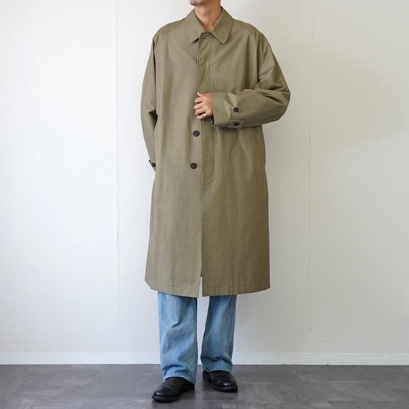 タイムレスなステンカラーコートを、STUDIO NICHOLSONらしいミニマルな解釈でアップデートした一着。 ロング丈のコートスタイルに機能性のある生地を使用し、動きやすさとエレガンスを両立。 都市での移動や季節の変わり目にぴったりの一着です。 表地にはコットンとナイロンをブレンドし、適度なハリ感と耐久性を確保。 軽やかで撥水性も備えており、日常使いからトラベルまで幅広く活躍します。 裏地はレーヨンとコットンの混紡で、滑らかな着心地と通気性を両立。 機能的なディテールとして、袖口のボタン仕様や、襟元をしっかり閉じられるチンストラップを装備。 防風性を高めつつ、クラシックな表情をプラスしています。 シンプルながら存在感のあるデザインは、カジュアルにもドレススタイルにも自然に馴染む万能アウターです。 モデル身長184cm 体重64kg 着用サイズS SIZE(cm) XS:着丈118 身幅67裄丈91 S:着丈120 身幅71 裄丈94 QUALITY 表地:COTTON59% NYLON41% 裏地:RAYON51% COTTON49%