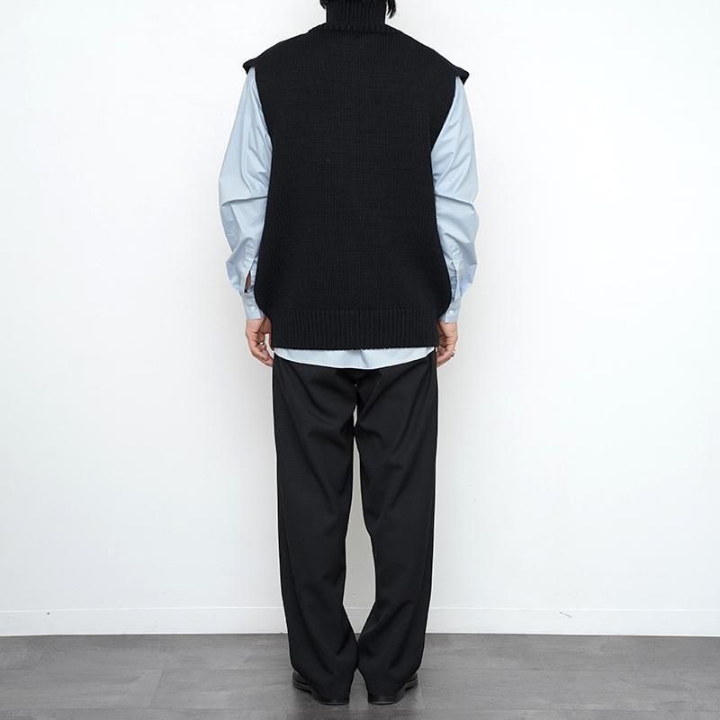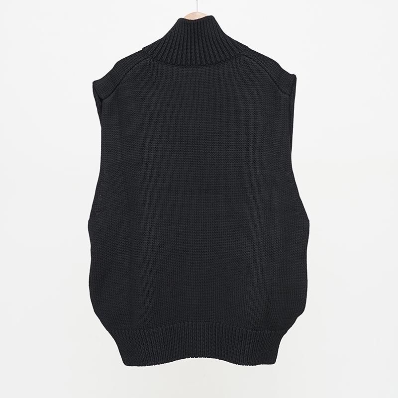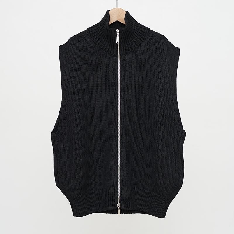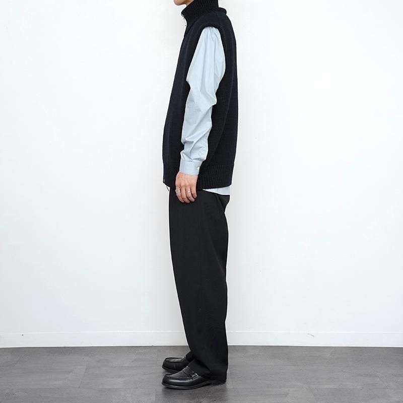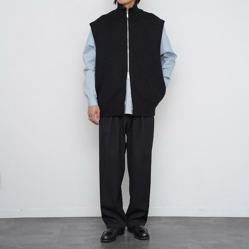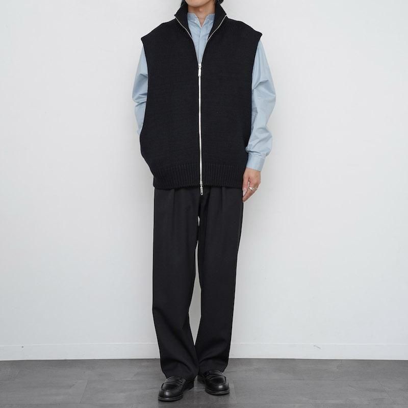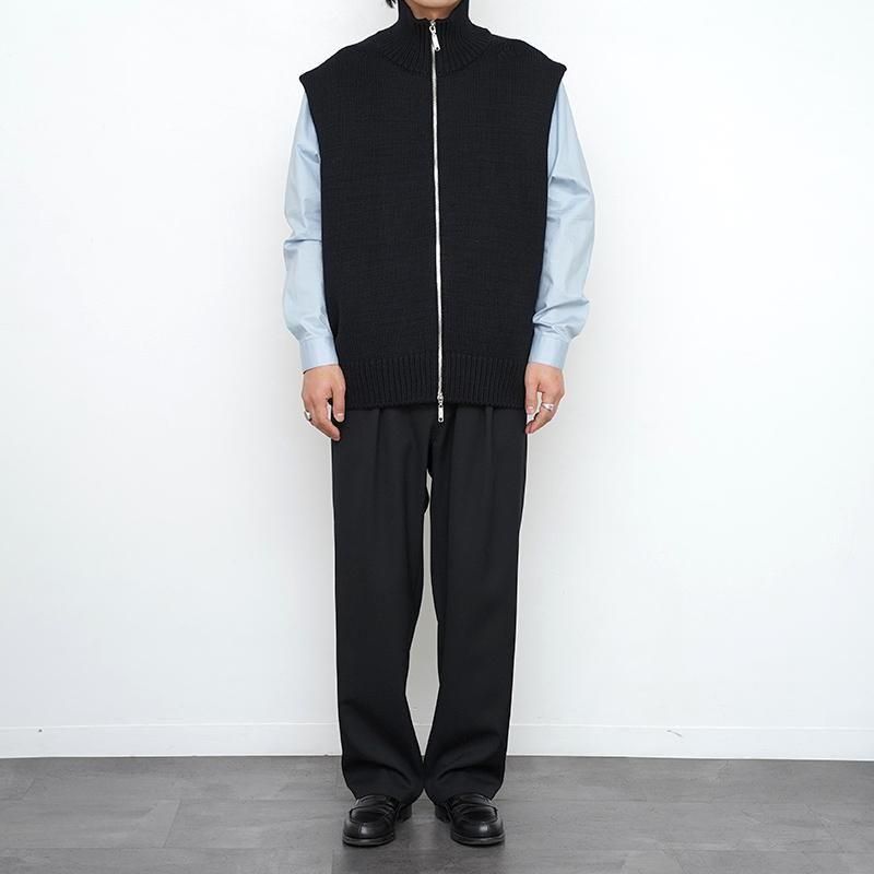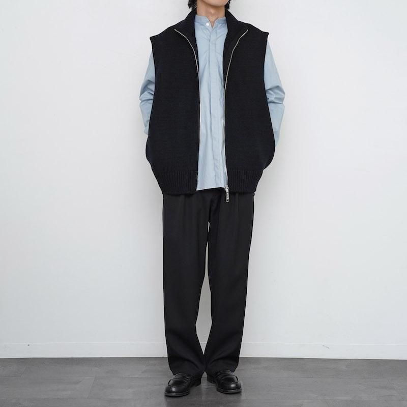 ウール100%を用いたドライバーズニットベスト。フロントはダブルジップ仕様で、シルエットの調整やレイヤードに幅をもたせています。脇を広めにとることで、シャツやスウェットを重ねても自然な収まりが生まれ、動きやすさも確保されています。 両サイドにはポケットを備え、実用性にも配慮。しっかりとした編み地とずっしりとした重量感が、着用時に確かな存在感を与えます。 首元はやや高めに設計され、ジップを上まで閉めると冷気を防ぐと同時に立体的な表情をつくります。 全体はゆったりとしたサイズ感で仕立てられており、ニュートラルな雰囲気を持ち合わせています。 重量感のあるニットでありながら、どこか柔和でしなやかな印象を感じさせる一着です。 モデル身長173cm 体重59kg 着用サイズ7 SIZE(cm) 7:着丈66 肩幅52 身幅60 QUALITY WOOL100%