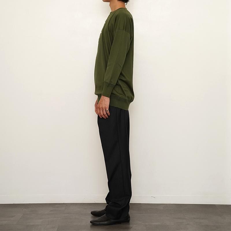 3つボタンのヘンリーネックデザインがアクセントとなり、インナーとしても一枚着としても活躍します。