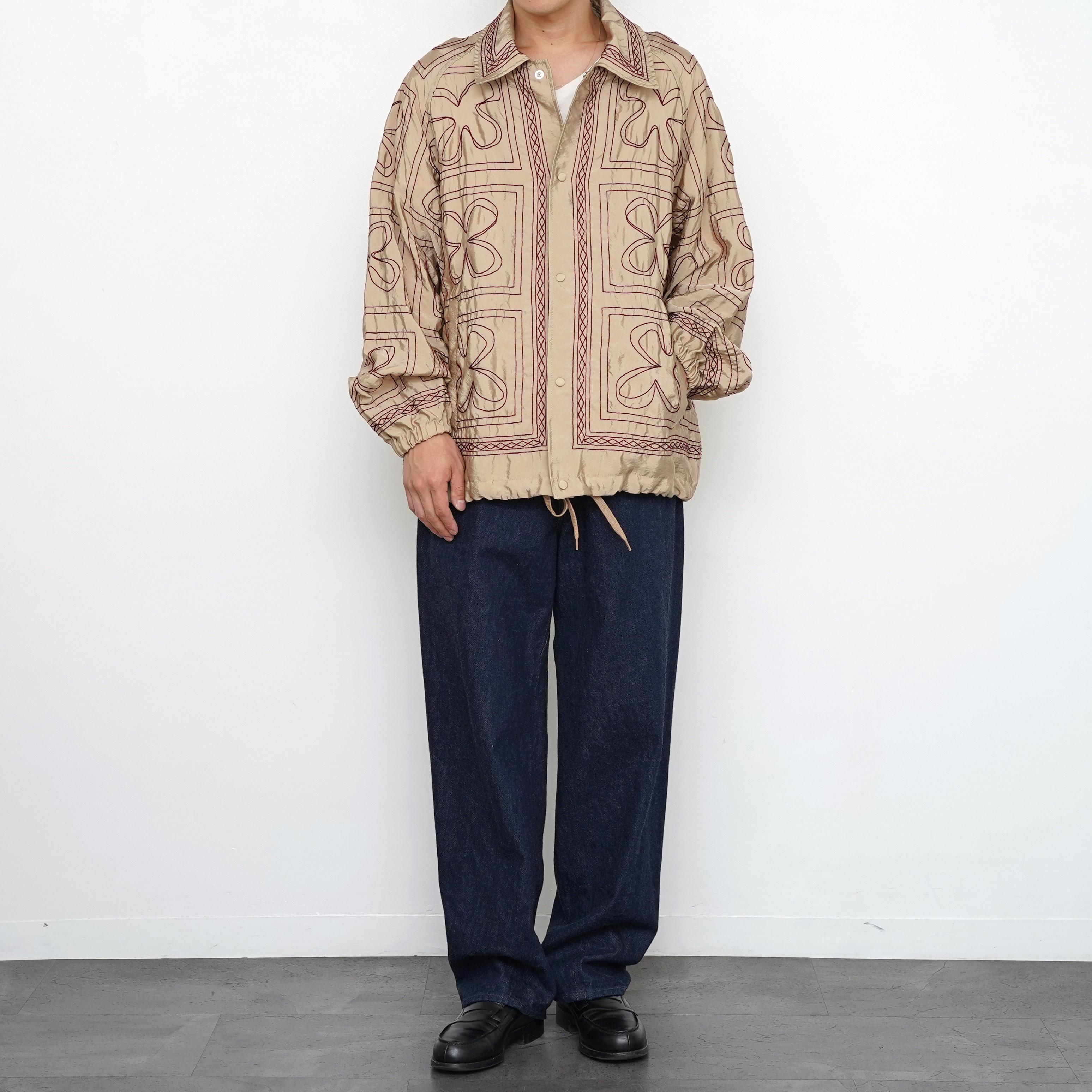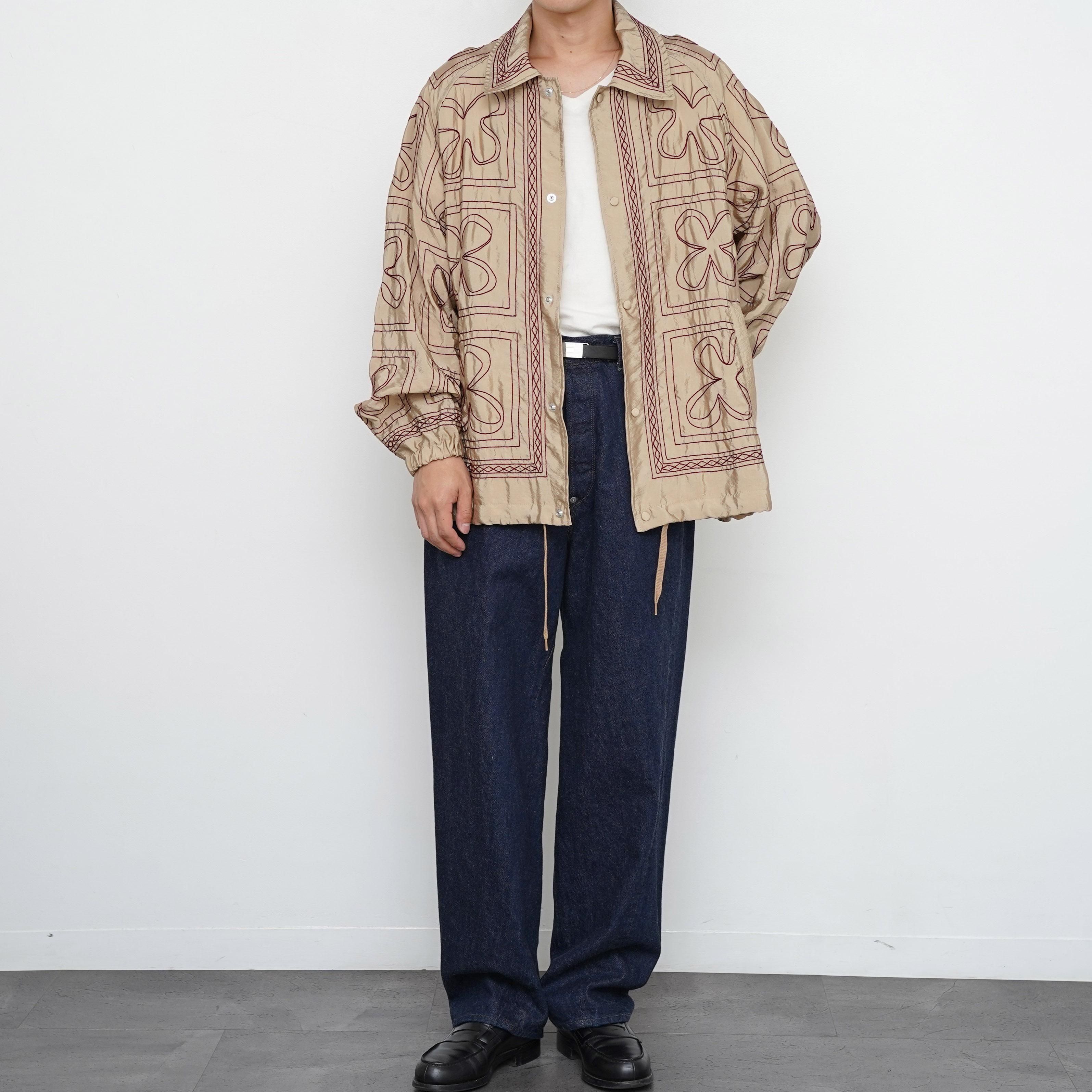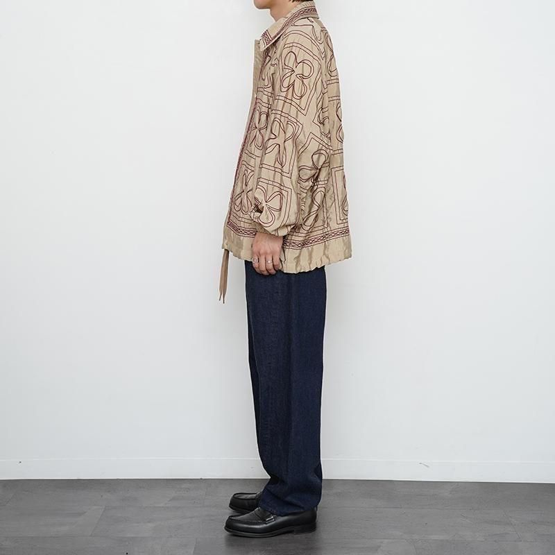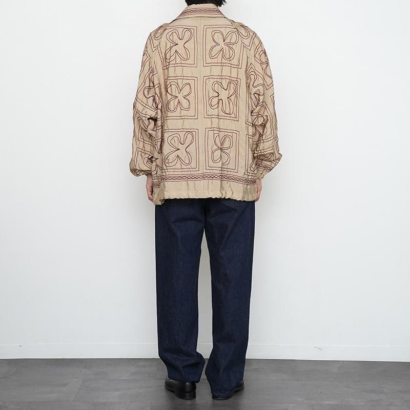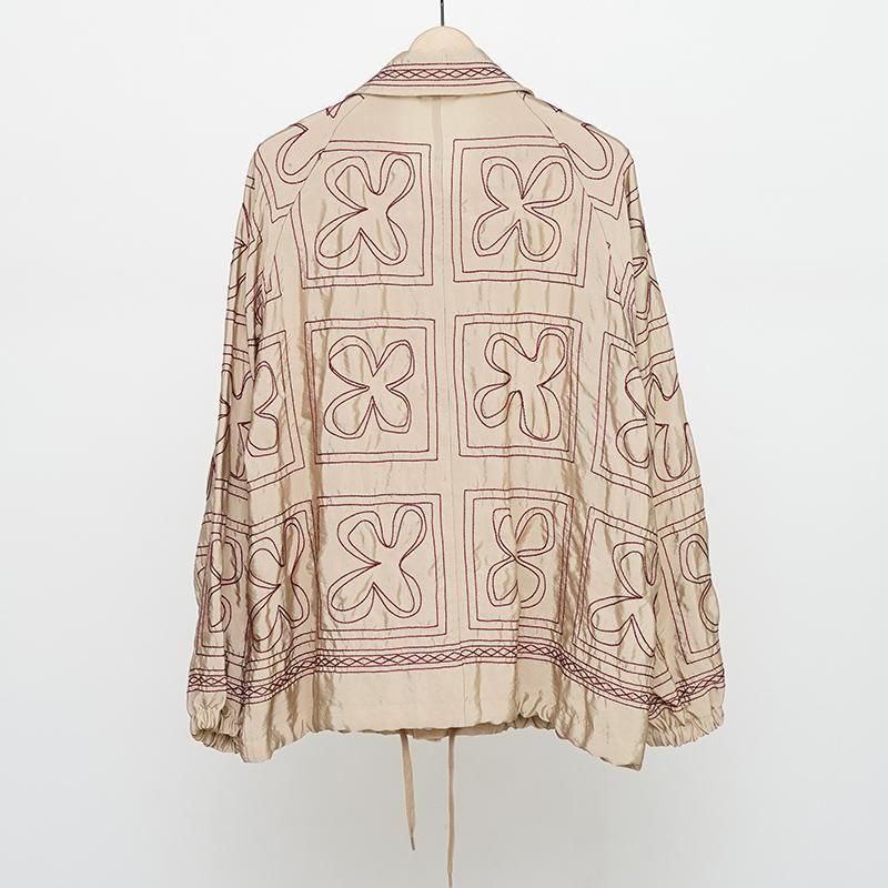 独特のシワ感と光沢感のある北陸産地で作られたヴィスコースナイロンの素材を使用。自由なムードの手描きの花柄はパターンにデザイナーが描いたものを桐生産地で1点1点パターンに合わせて刺繍されています。ハンドステッチ風のタッチにするために糸を撚り合わせ、大きめのストロークで刺繍することでザックリとしたハンドエンブロイダリーのようなムードに仕上げています。 モデル身長173cm 体重59kg 着用サイズ3 SIZE(cm) 3:着丈72 身幅69 裄丈85 QUALITY NYLON79% RAYON21% EMBROIDERY THREAD:CUPRO100%