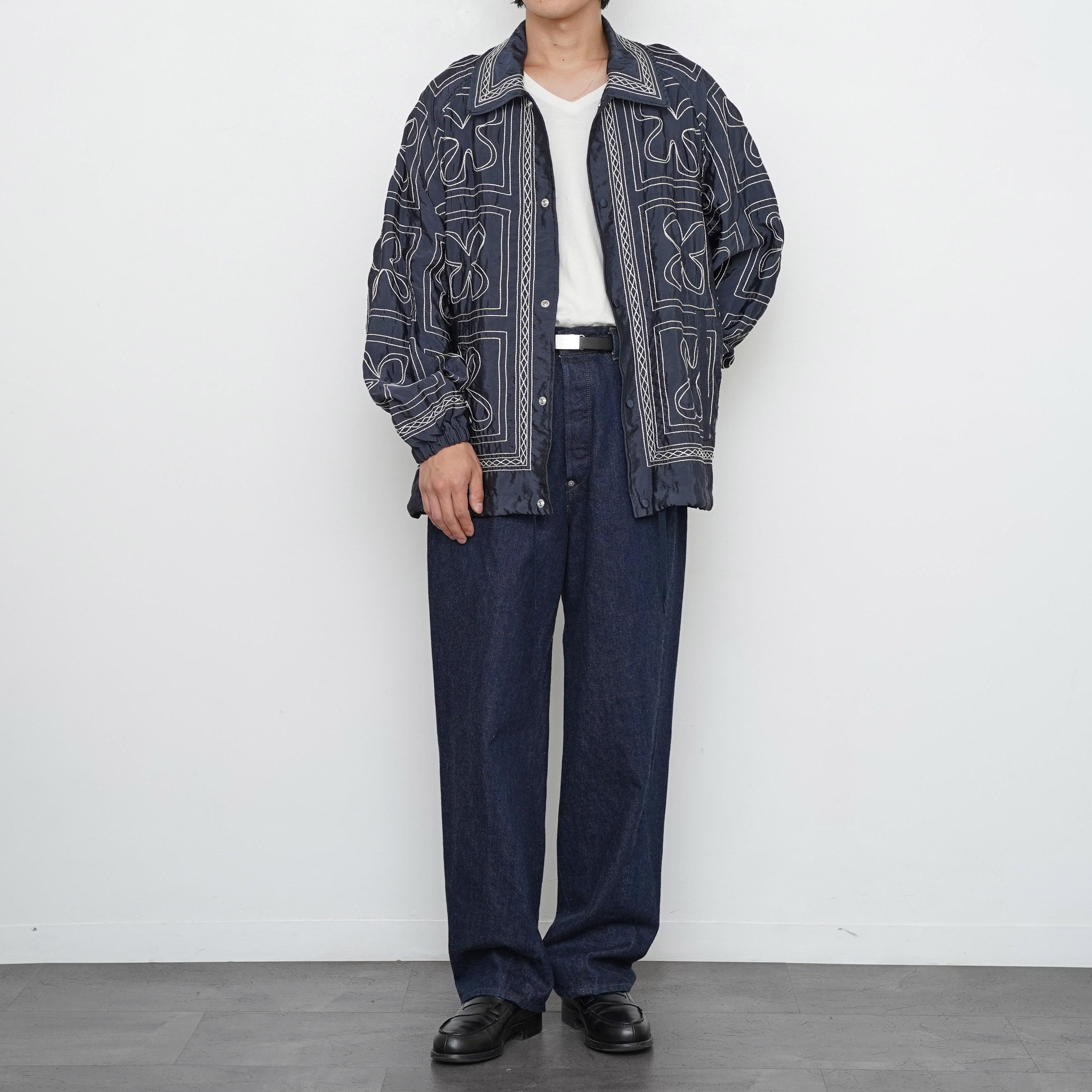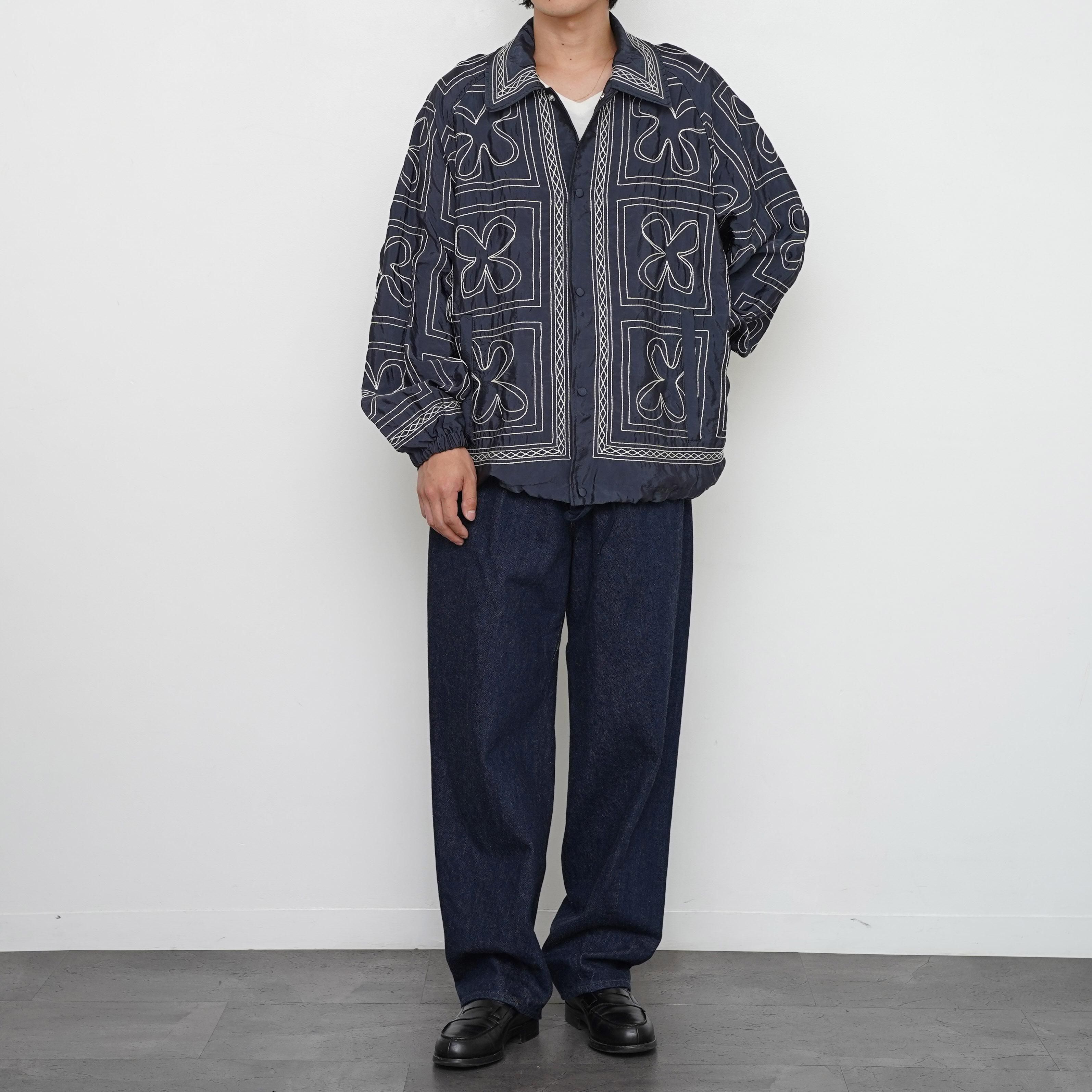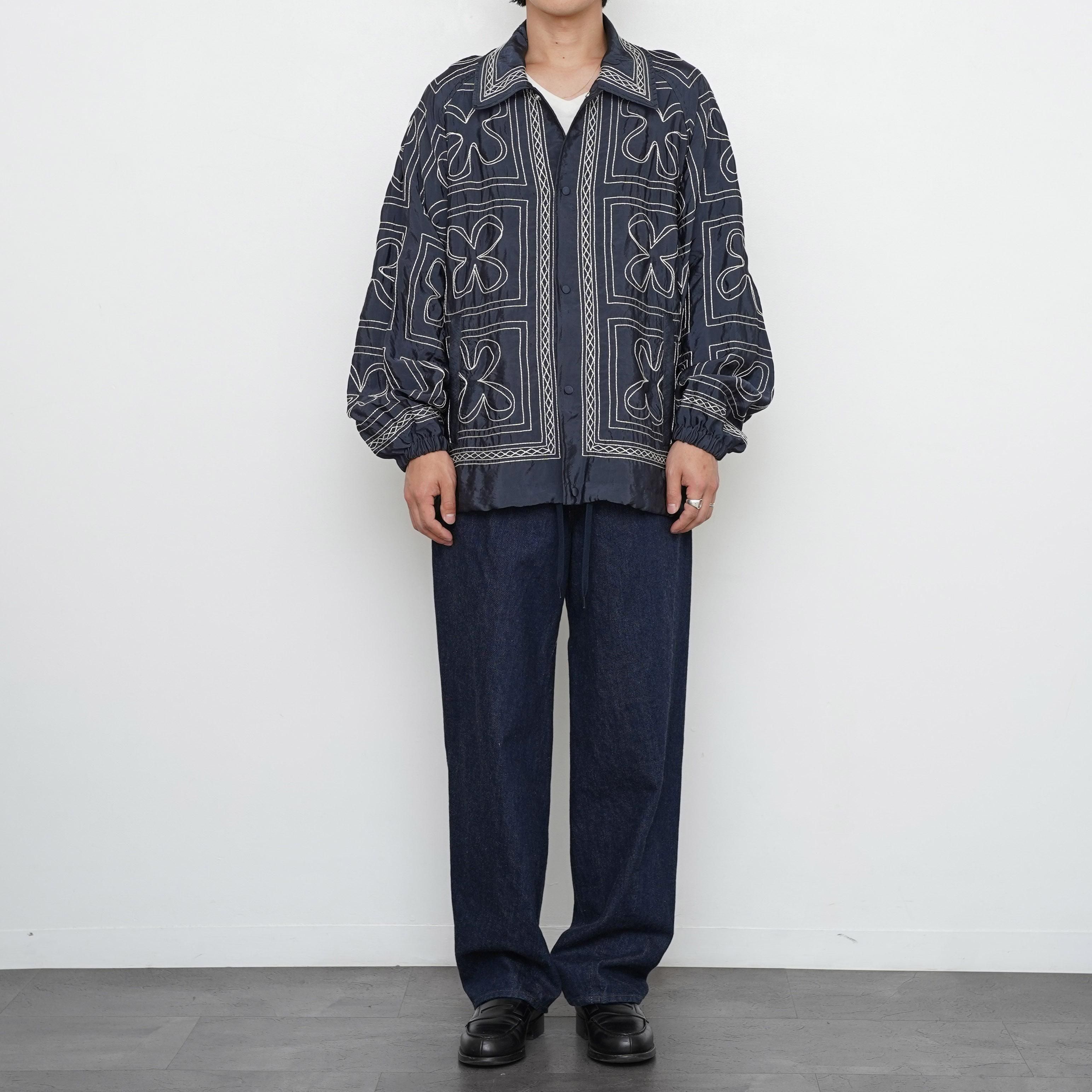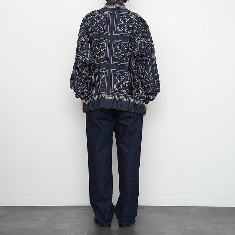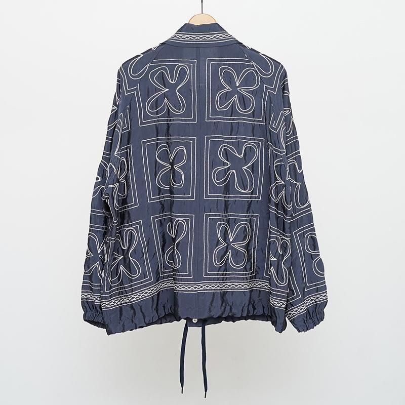 独特のシワ感と光沢感のある北陸産地で作られたヴィスコースナイロンの素材を使用。自由なムードの手描きの花柄はパターンにデザイナーが描いたものを桐生産地で1点1点パターンに合わせて刺繍されています。ハンドステッチ風のタッチにするために糸を撚り合わせ、大きめのストロークで刺繍することでザックリとしたハンドエンブロイダリーのようなムードに仕上げています。