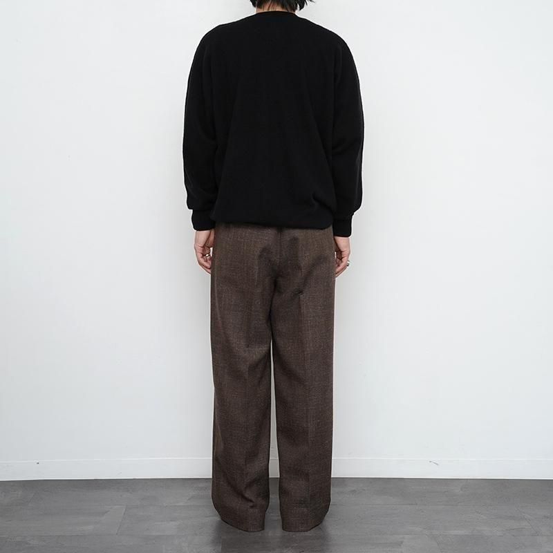 2タックのワイドパンツ。ゆったりとしたワイドシルエットで綺麗な中にもリラックス感のあるシルエットはセットアップでも単品でも。ベルト端がカットオフになっていたり少し撚りのあるデザインもポイント。 厚手のツィードでなくライトなツィードを作りたく尾州産地で糸から別注した素材。ポリエステル糸とリネン糸を撚糸して独特のチラチラとしたツィード感を作っています。 モデル身長173cm 体重59kg 着用サイズ3 SIZE(cm) 3:ウエスト81 股下74 股上33 ワタリ39 裾幅28 QUALITY WOOL53% POLYESTER37% LINEN10% LINING:CUPRO100%