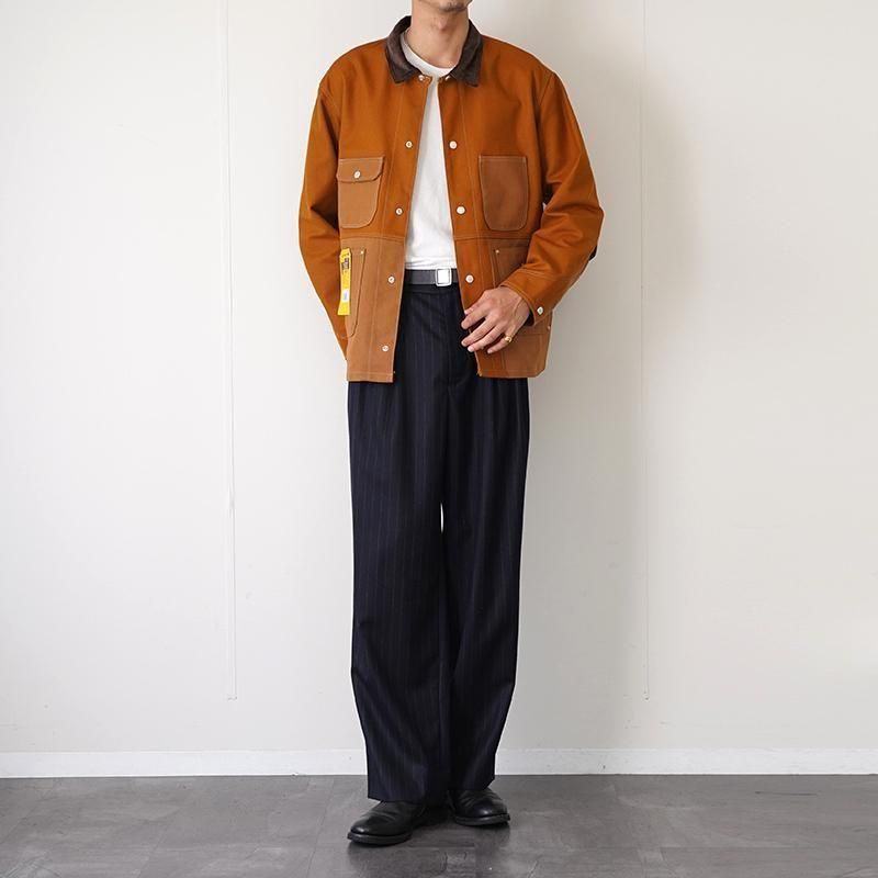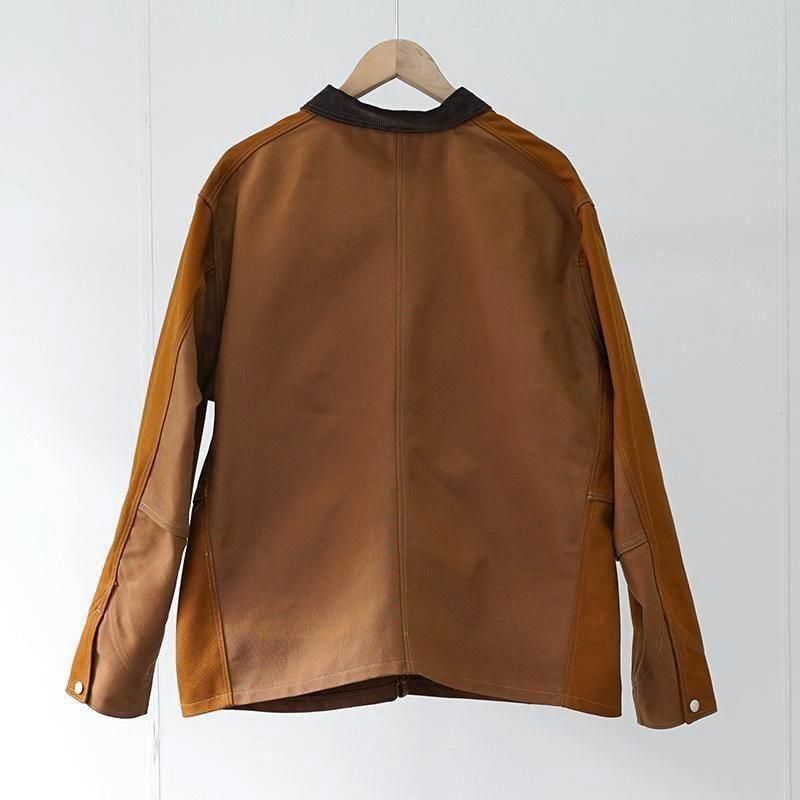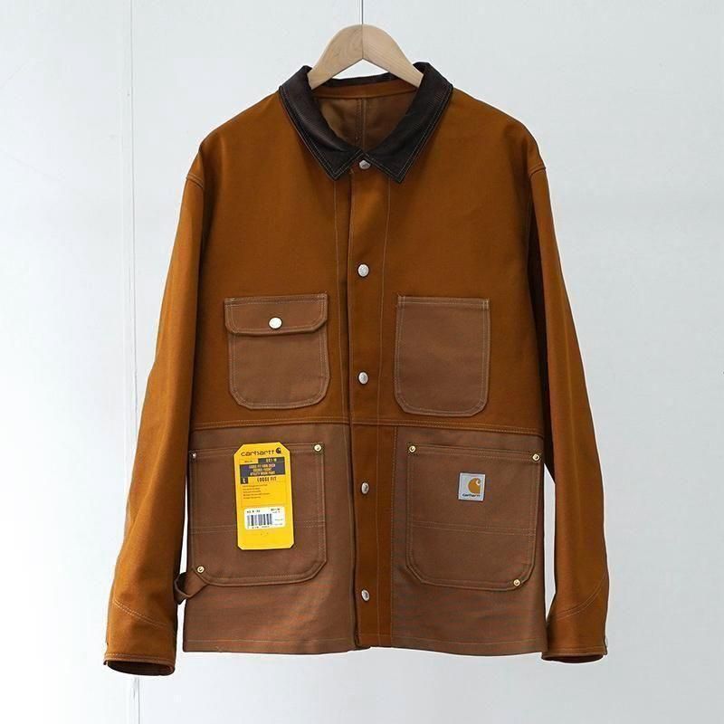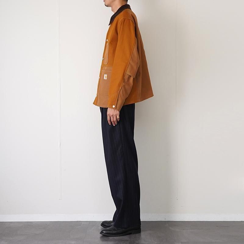 カーハートのパンツをリメイクしたカバーオールジャケット。 日本の少人数の職人チームによる手仕事です。 USカーハートのダブルニーパンツを解体し、ダック生地と組み合わせて再構築しました。 ヴィンテージの風合いを残しながらも、現代的なシルエットと機能性を兼ね備えた唯一無二のアイテムです。 耐久性に優れた12ozダック地を採用。 ヴィンテージ感漂うトラディショナルなデザインに、4つの大容量ポケットとリベット補強を施し、ワークらしい無骨な雰囲気に仕上げています。 襟元はコーデュロイ素材で切り替えられ、程よい上品さをプラス。 左裾にはCarharttおなじみのスクエアラベルを配置。 ボタンには“FOREMOST”刻印入りでヴィンテージ感を強調。 ※ハンドメイドによるリメイク商品のため、1点ごとに多少の個体差がございます。 ※ヴィンテージ生地特有のスレや色ムラが見られる場合がございますが、商品の特性としてお楽しみください。 モデル身長184cm 体重64kg 着用サイズL SIZE(cm) M:着丈68 肩幅49 身幅62 袖丈60 L:着丈72 肩幅50 身幅65 袖丈62 QUALITY COTTON100%