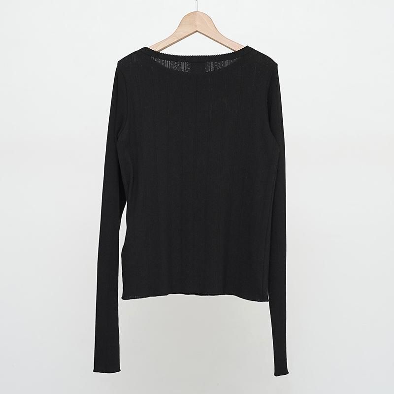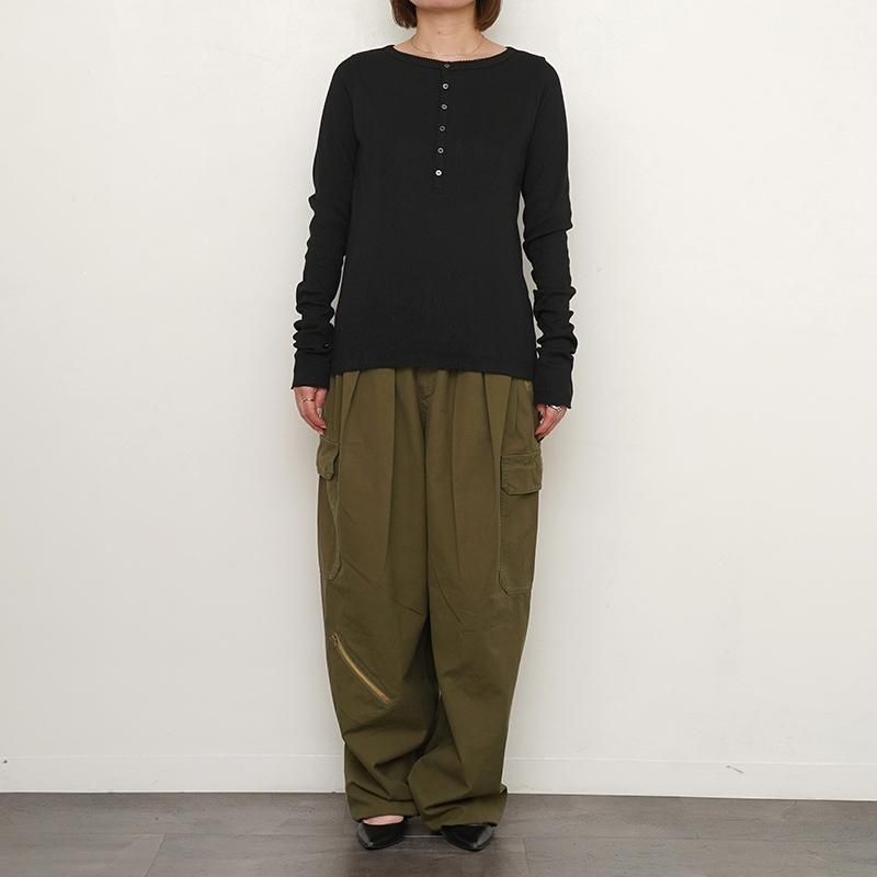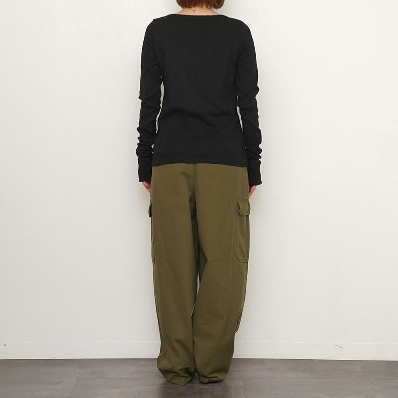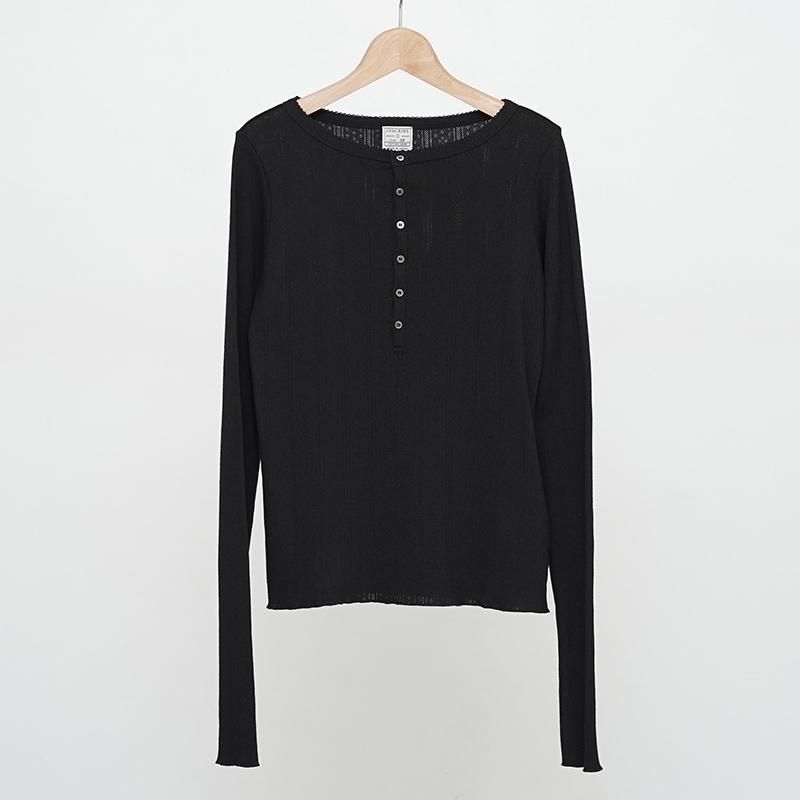 アンダーウェアのような快適な着心地のヘンリートップス。 USED感のあるさりげないレースの柄がほんのり浮かびます。 すっきりとしたネックもレース仕様で女性らしいヘルシーな印象に。 長めの袖をくしゅくしゅとためてシンプルですが遊びのあるデザインです。 モデル身長155cm 着用サイズ38 SIZE(cm) 38:着丈60 肩幅36 身幅41 袖丈73 QUALITY COTTON100%