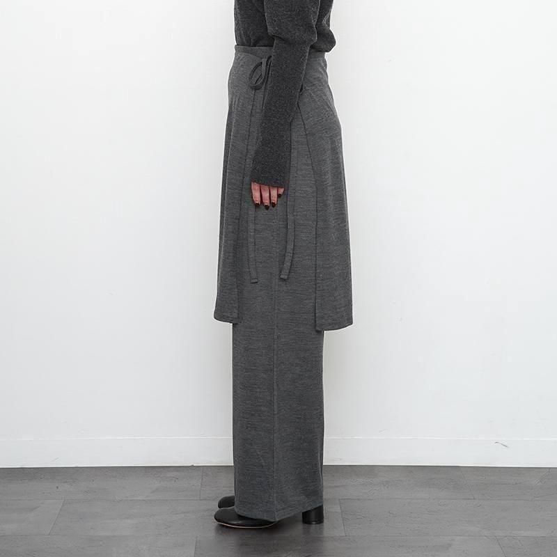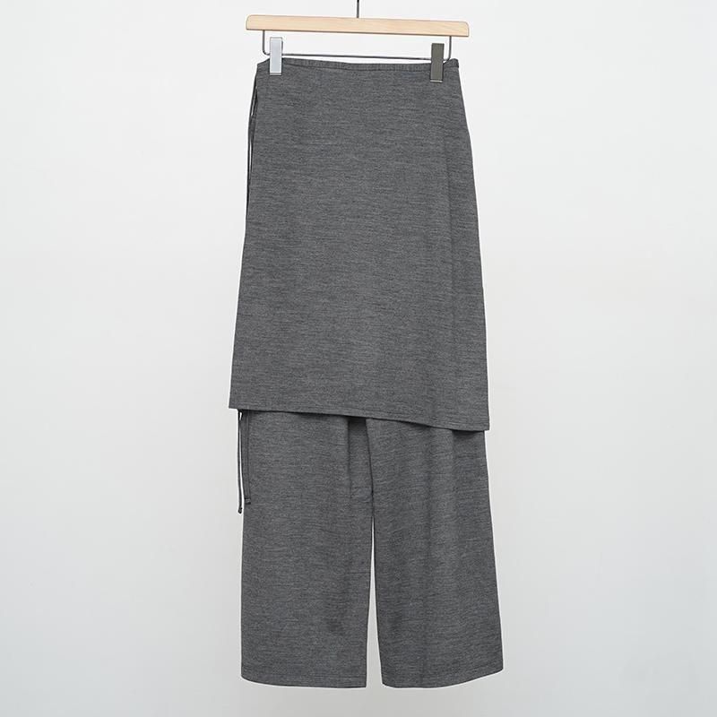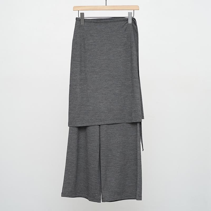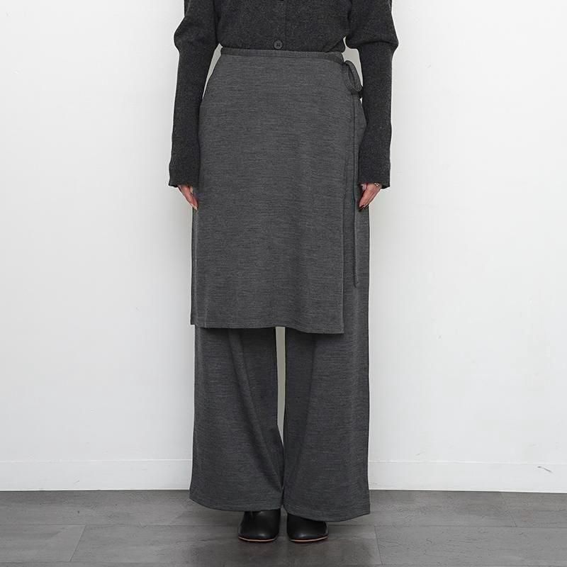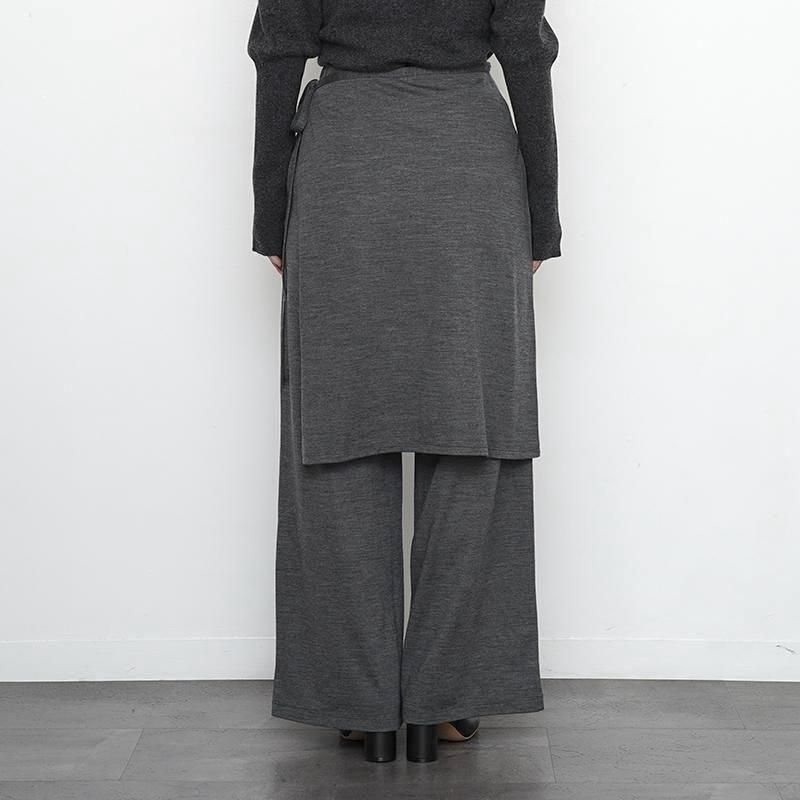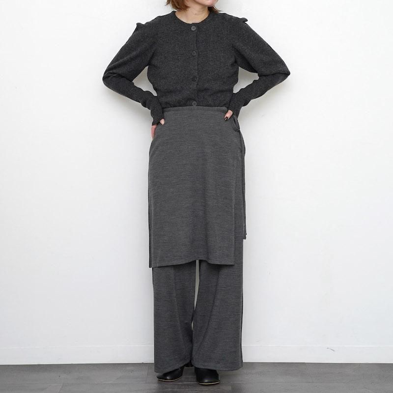 エプロンとパンツがセットになったアイテム。シンプルながら、これ一枚でコーディネートが決まるアイテム。 細番手ウール糸を使用し、薄手で使いやすい肉感ときめ細やかでコンパクトな表情に仕上げた素材。美しい光沢と優れたストレッチ性があり、ウール特有のチクチク感を軽減。 【スタッフコメント】 マンネリ化しがちな冬のスタイリングが楽しくなるレイヤードパンツ。 ベロアやニットなどシーズン感を感じられる素材との組み合わせで季節感をより演出できます。腰回りにデザインのあるアイテムなので旬なショートトップスとの相性も抜群。 モデル身長155cm 着用サイズ1 SIZE(cm) 1 パンツ:ウエスト62 股上31 股下67.5 裾幅29 スカート:幅66 丈59 2 パンツ:ウエスト64 股上32 股下71 裾幅29 スカート:幅72 丈60 QUALITY WOOL100%