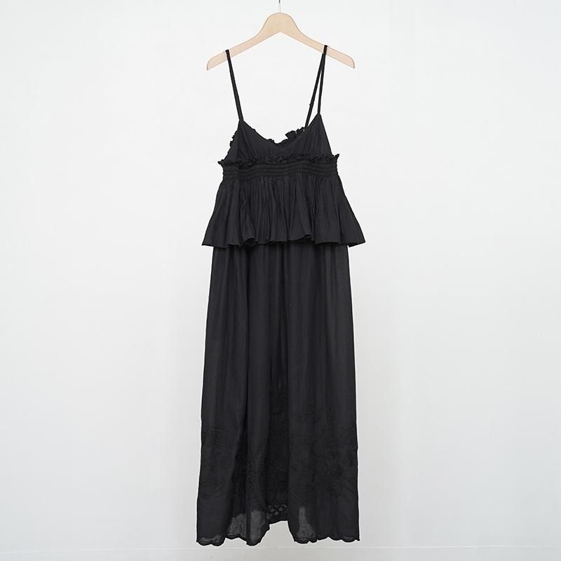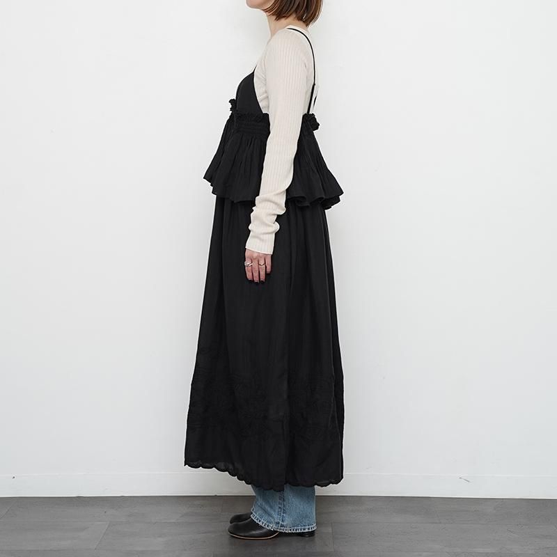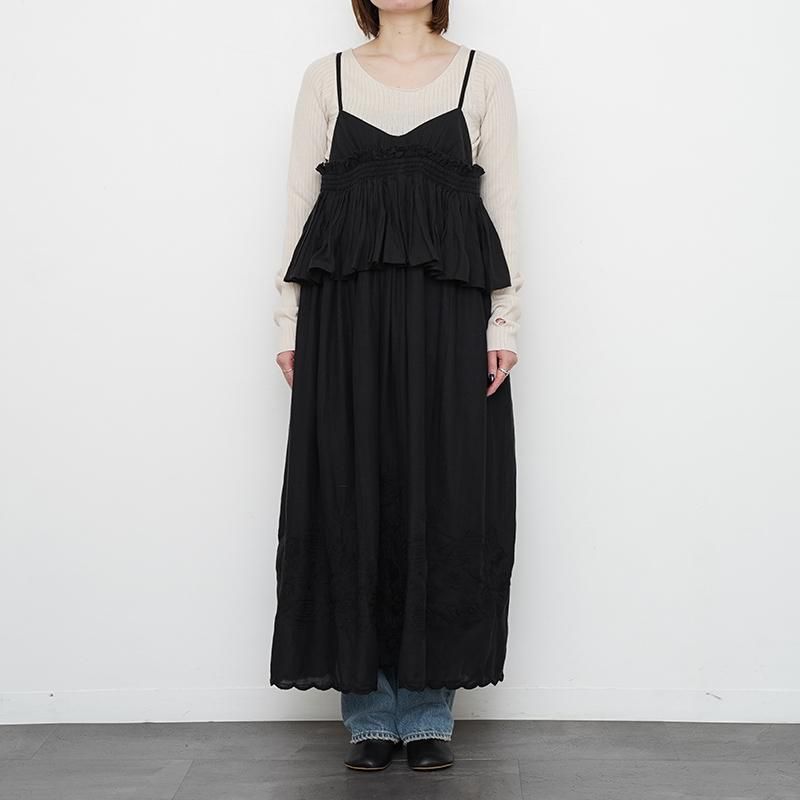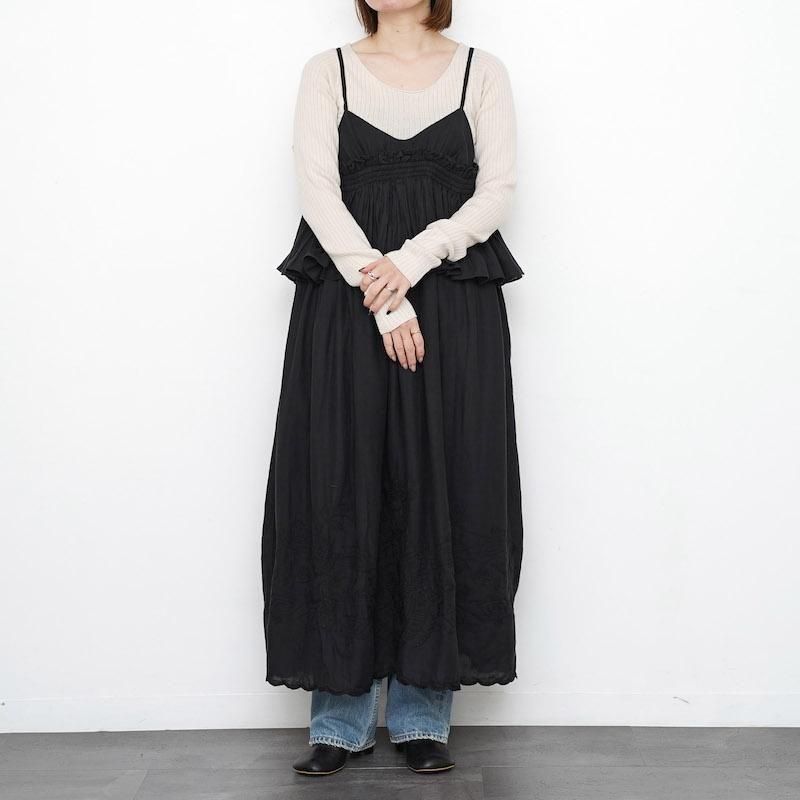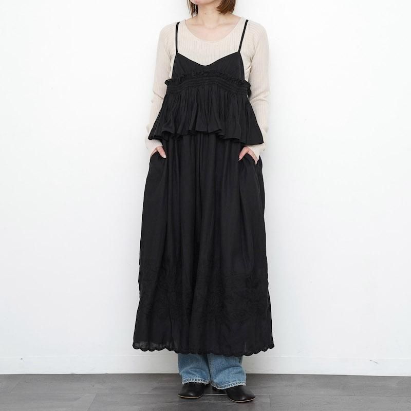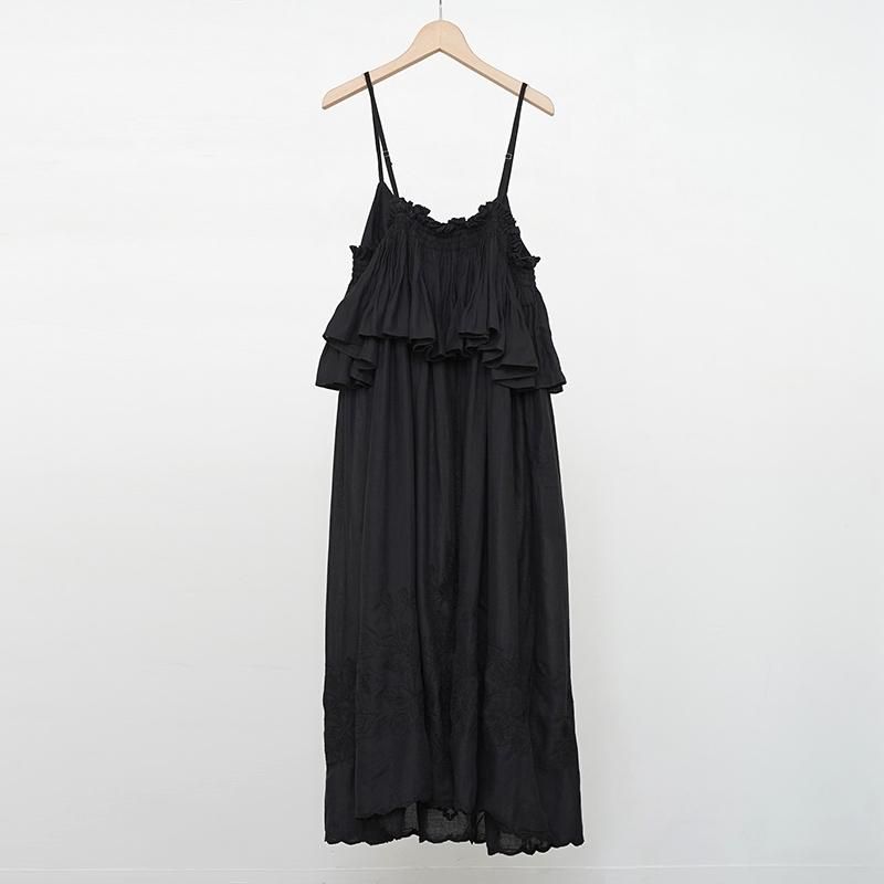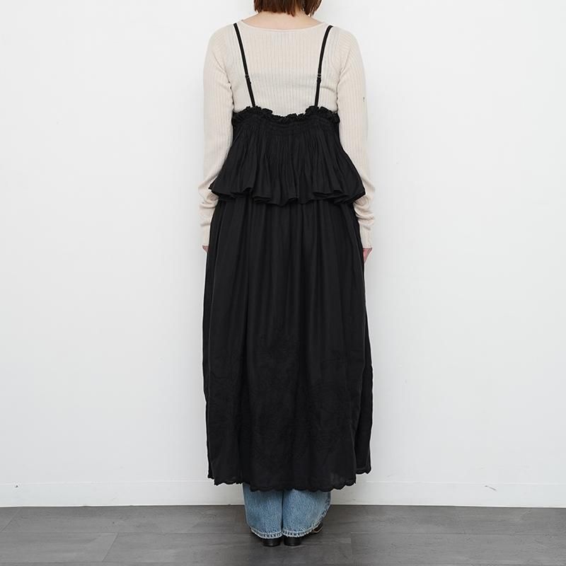インドのコットンジョーゼットでお作りしたキャミドレスです。 胸元はギャザーとフリルでcrinkle crinkle crinkleらしいボリューム感を出し、スカート部分には、ヴィンテージのテーブルクロスから着想した刺繍をたっぷりと施し、特別感のある一着に仕上げています。 ブラックはあえて裏地を入れずお作りしており、刺繍の透け感とレイヤードをお楽しみください。 モデル身長155cm 着用サイズF SIZE(cm) F:着丈97 身幅40 QUALITY COTTON100% 刺繍糸:POLYESTER100%