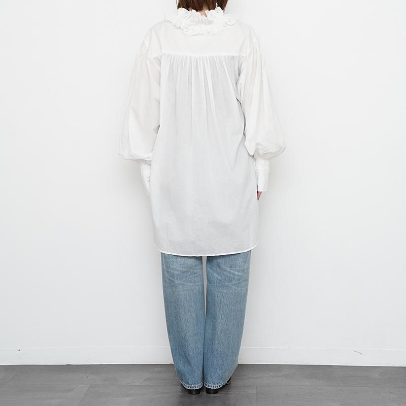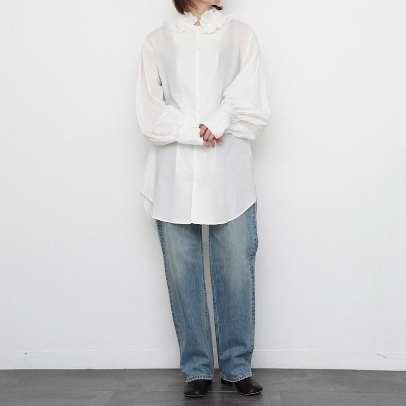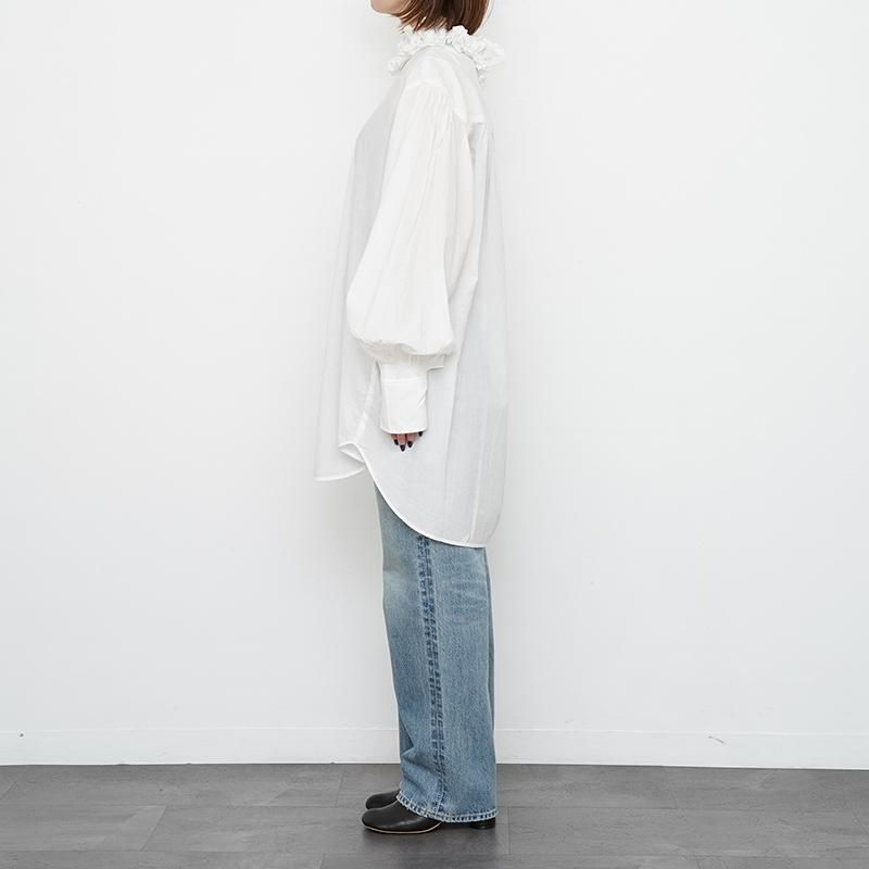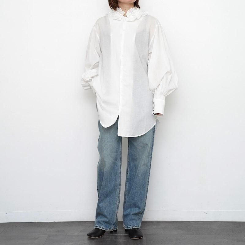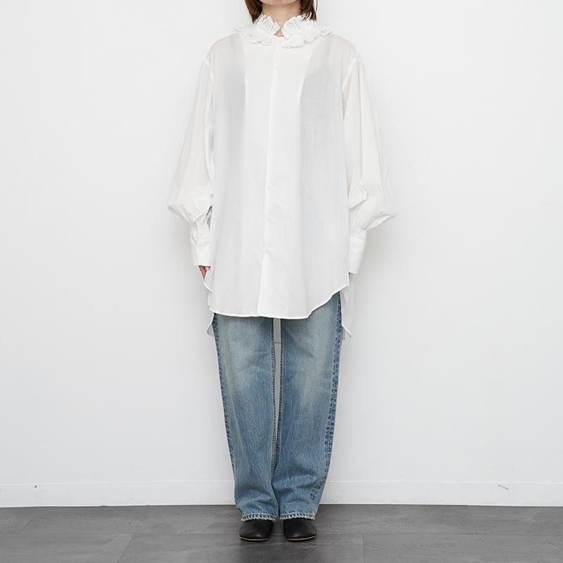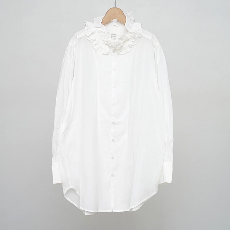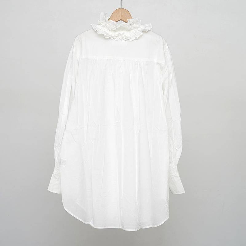 crinkle crinkle crinkleのシグニチャーアイテムである、cotton frill coller shirtsが今期も登場いたしました。 コットンキャンブリックを使用したフリルブラウス。 メンズのフォーマルシャツに着想した長めの着丈に、花びらのようなフリルネックをあしらいました。 メイン、羽織り、レイヤードと様々なスタイリングでお楽しみください。 モデル身長155cm 着用サイズF SIZE(cm) F:着丈前81 着丈後87 肩幅46 身幅56 袖丈63 QUALITY COTTON100%