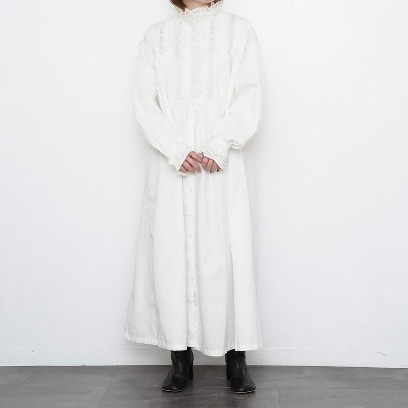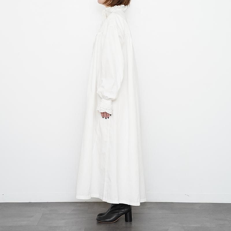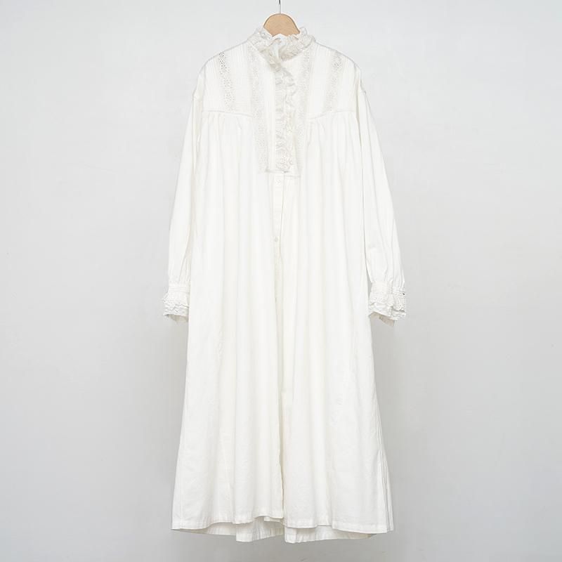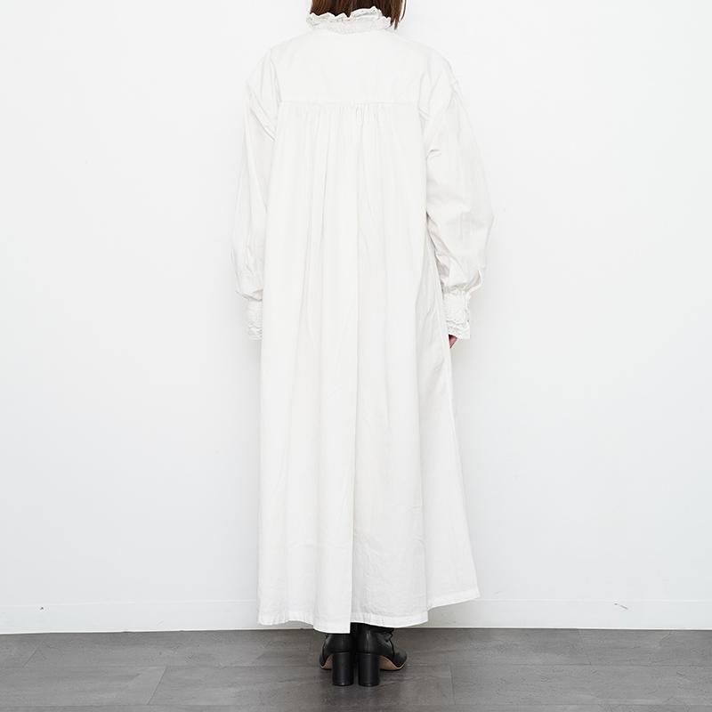 インドコットンでお作りしたシャツワンピースです。 ヴィンテージのシャツワンピースをインスピレーションに、現代のスタイルに合わせた シルエットで仕上げました。 ヴィンテージに多用されるテクニックで細部までこだわったシャツワンピースをお楽しみください。 モデル身長155cm 着用サイズF SIZE(cm) F:着丈前119 着丈後123 肩幅52 身幅58 袖丈56 QUALITY COTTON100% レース:COTTON100% 刺繍糸:POLYESTER100%