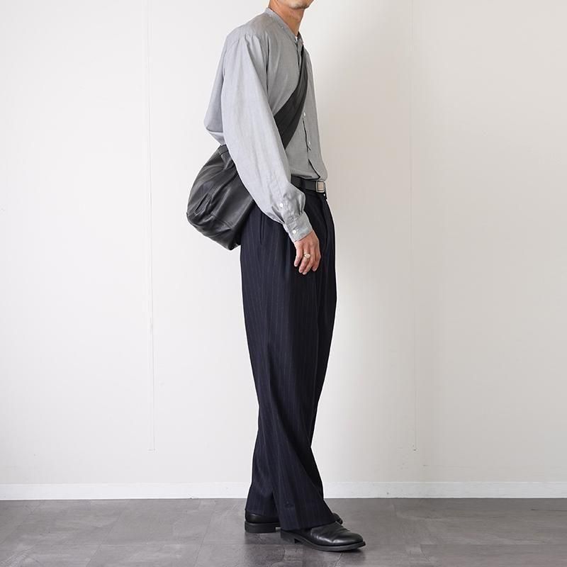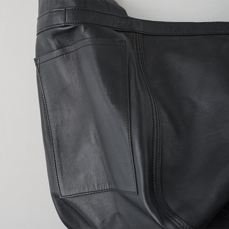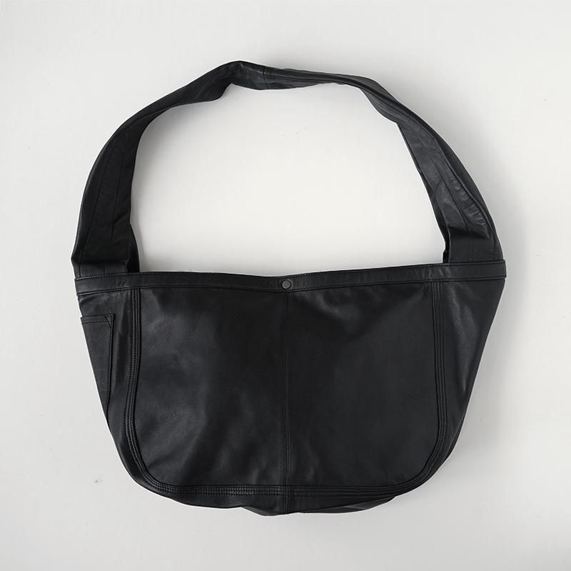 しなやかな質感とミニマルなデザインが魅力のレザーショルダーバッグ。 軽く柔らかな羊革(シープスキン)を贅沢に使用し、肩に掛けたときに自然に身体へ寄り添うフィット感が特徴です。 広めのマチと十分な容量で、デイリーから小旅行まで幅広く活躍。 太めに設計されたショルダーストラップは、荷物の重さをしっかり分散し、長時間の使用でも肩に食い込みにくい仕様。 安定感がありながら、デザインのアクセントとしても映え、ユニセックスなスタイルに馴染みます。 シンプルで飽きのこないフォルムは、カジュアルにもきれいめにも合わせやすく、シーンを選ばず使える一品。 しっとりとした艶を放つブラックの羊革は、使い込むほどに柔らかさと深みが増し、唯一無二の表情へと育っていきます。 SIZE(cm) F:高さ29 ヨコ57 マチ24 QUALITY 羊革