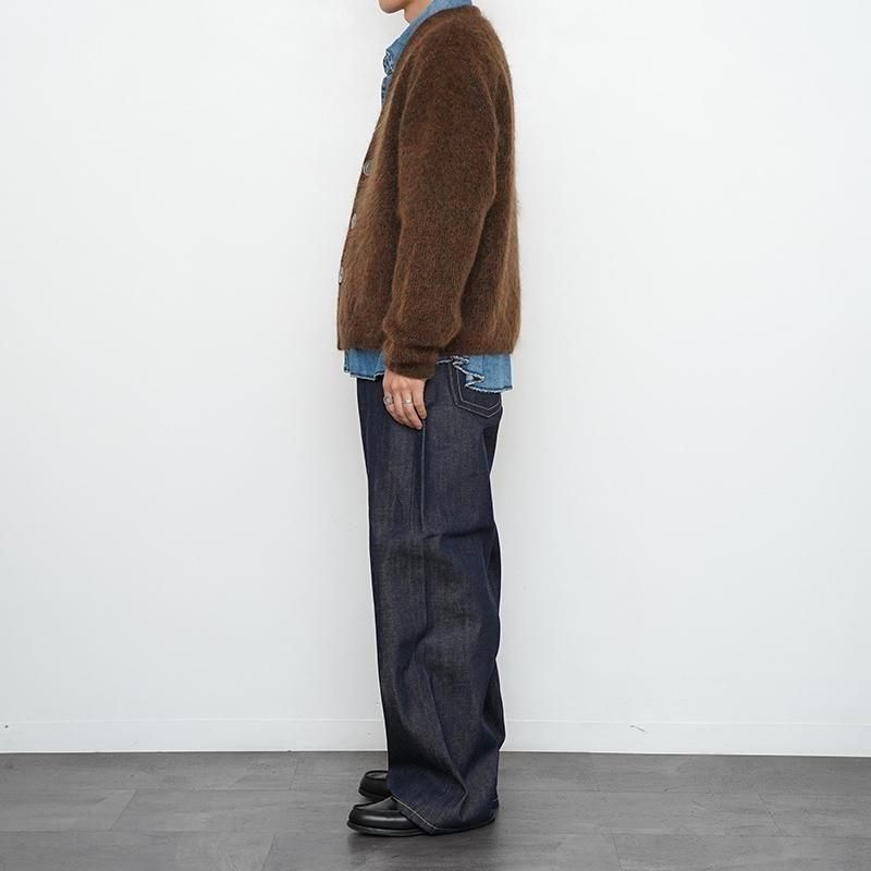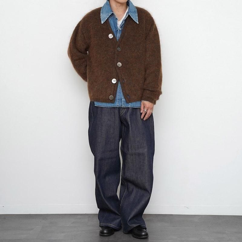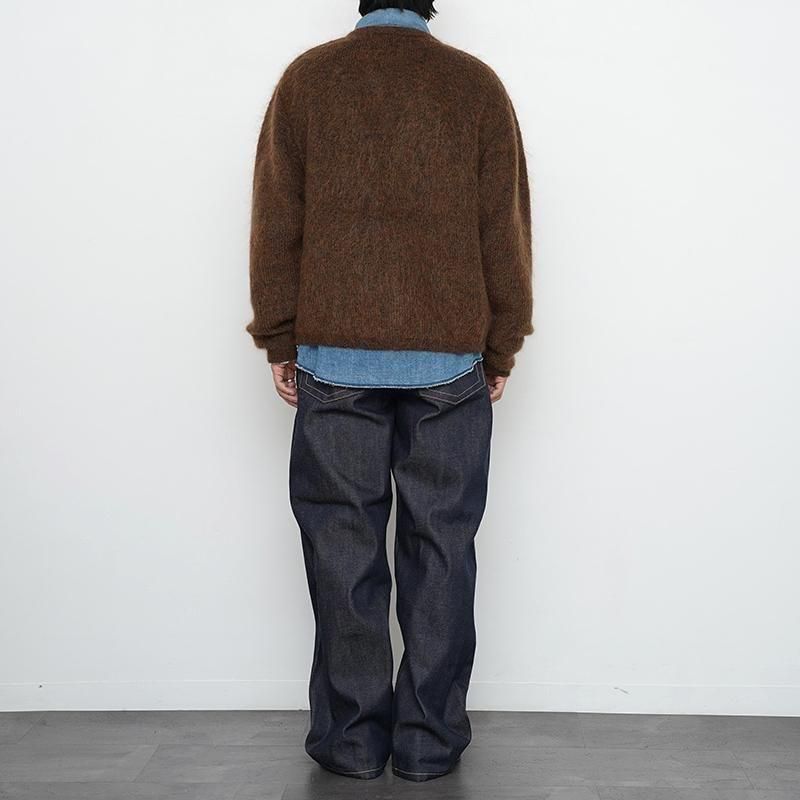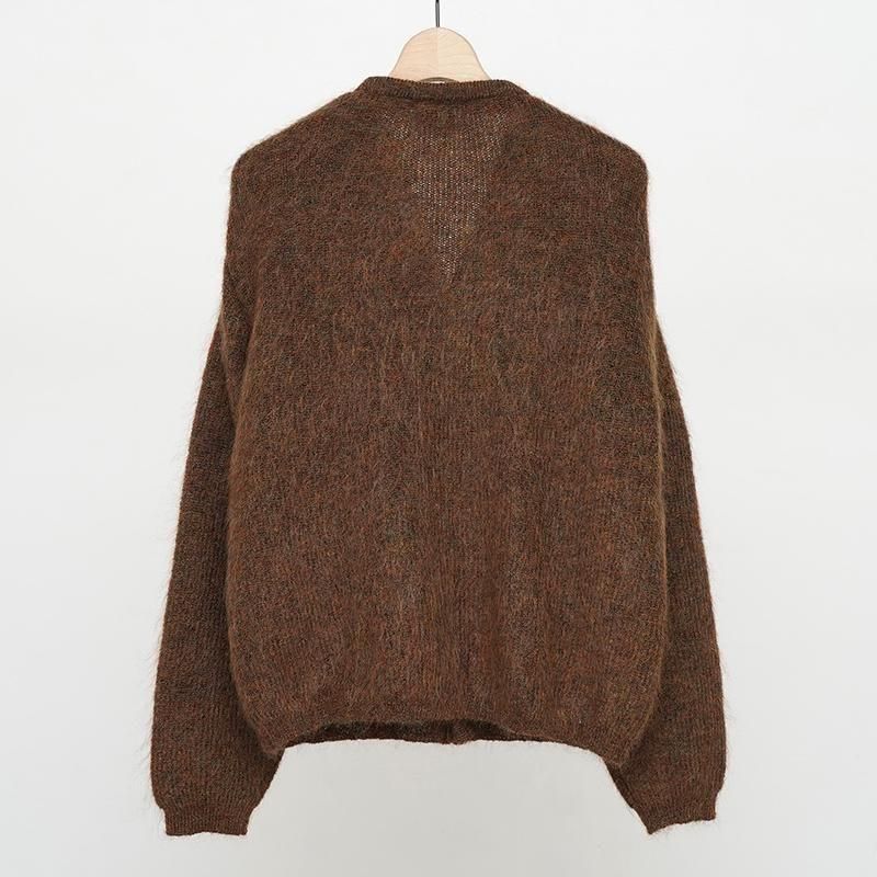 1950〜60年代のキッズモヘヤカーディガンを拡大したかのような発想から生まれた一着。毛足の長いモヘヤ混の糸を用い、軽やかで柔らかな風合いと、古着のような奥行きある混色カラーを表現しています。