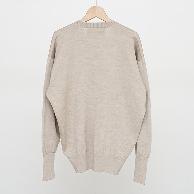 ネックは浅めの開きで、一枚でも上品に着こなせるほか、シャツやタートルとのレイヤードも映えるデザイン。袖口の長めリブがさりげないアクセントを添えています。