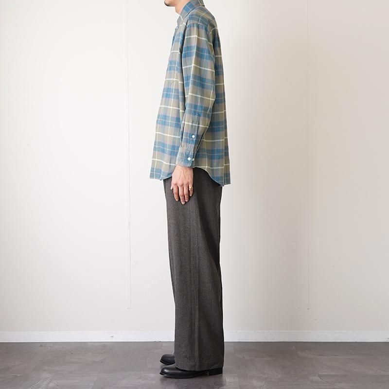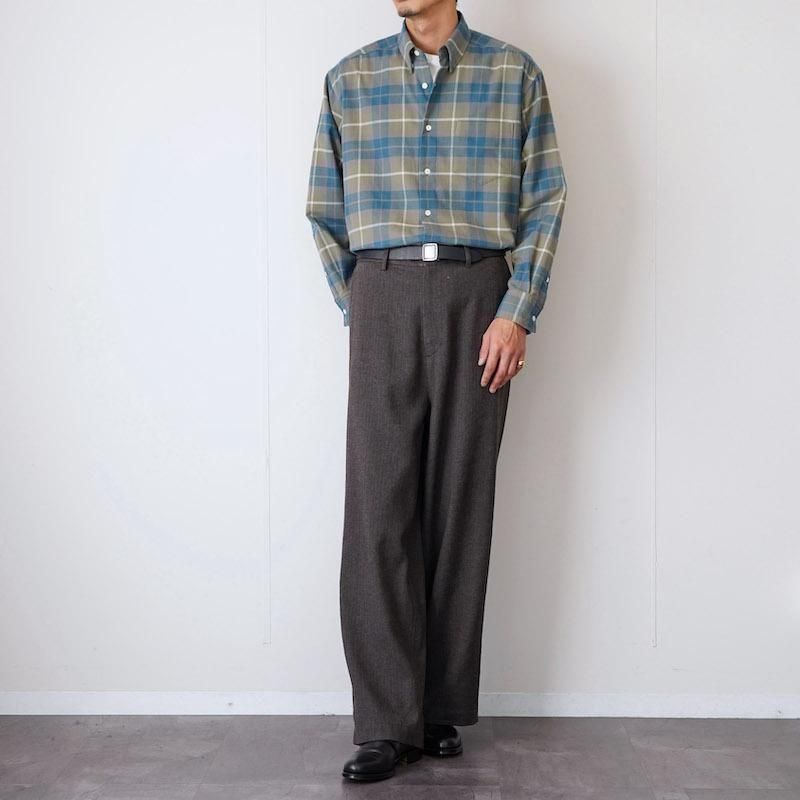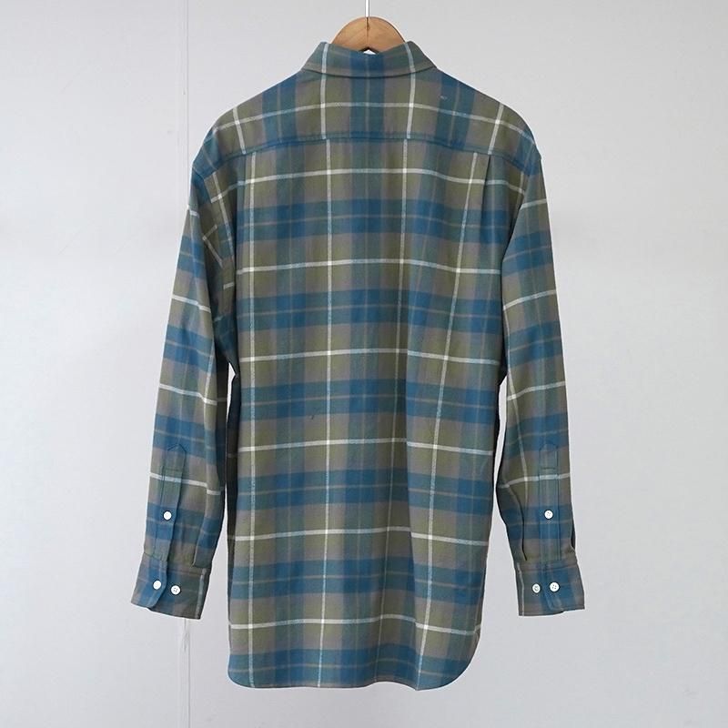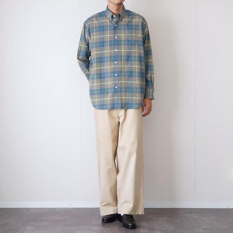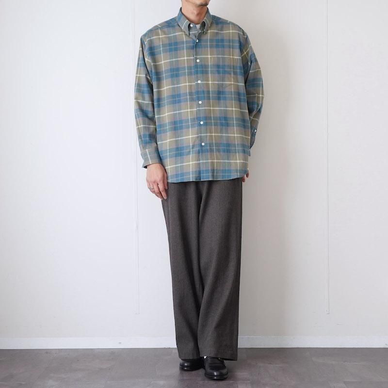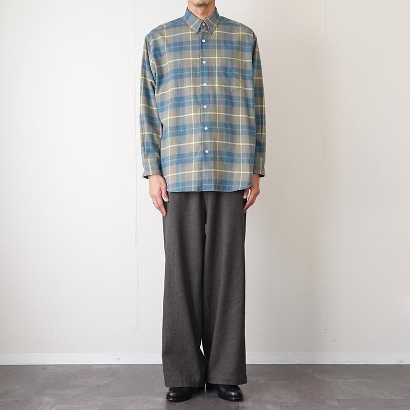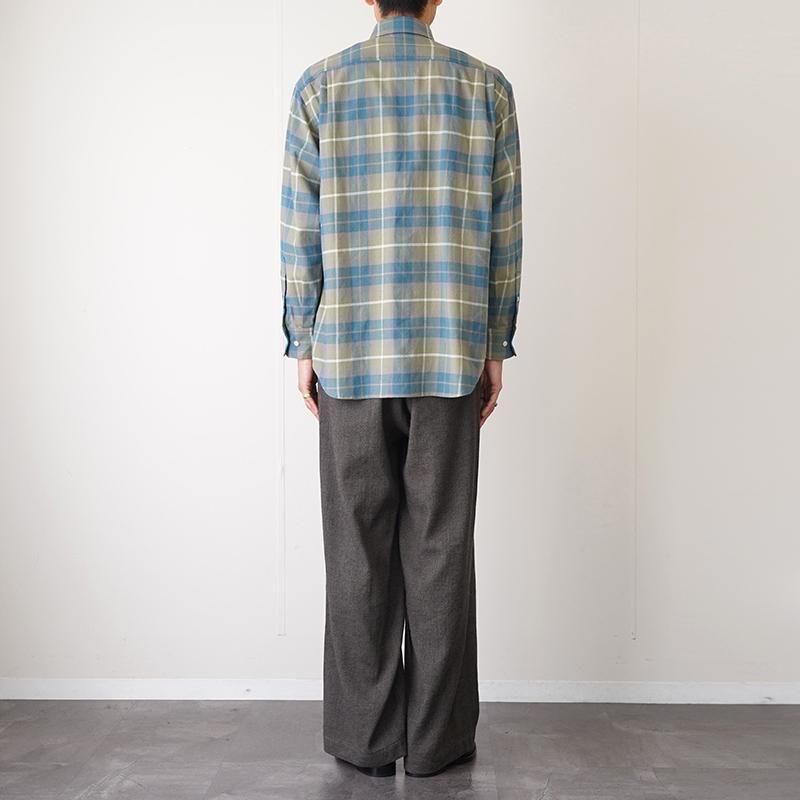 クラシックなチェック柄をベースに、i am dorkらしいニュアンスを効かせた一着。上質なコットン100%の生地は柔らかく、着るたびに身体に馴染み、風合いを深めていきます。 程よくゆとりを持たせたシルエットは、シャツとしてはもちろん、軽い羽織りとしても活躍し、ジャケットやコートのインナーとしても存在感を発揮します。 ナチュラルな雰囲気の中に大人の上品さを添えるチェックシャツ。デニムやチノと合わせればカジュアルに、スラックスと組み合わせればモダンな着こなしに仕上がり、シーンを問わず長く楽しめるアイテムです。 モデル身長184cm 体重64kg 着用サイズ2 SIZE(cm) 2:着丈78.5 肩幅53 身幅66 袖丈59 QUALITY COTTON100%