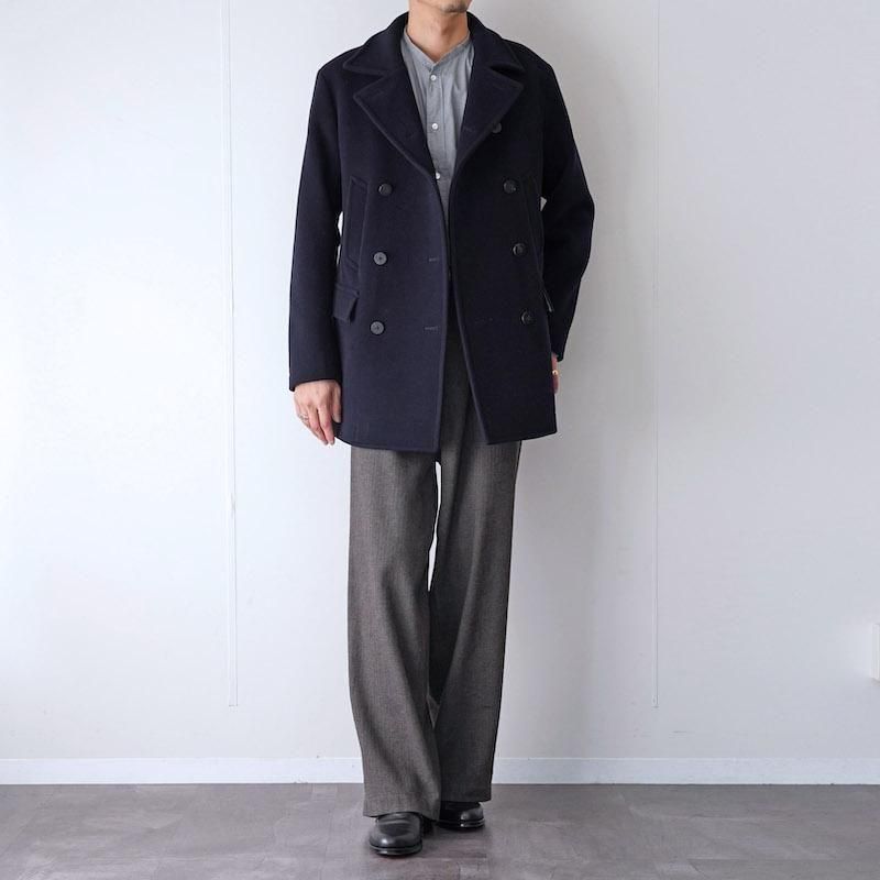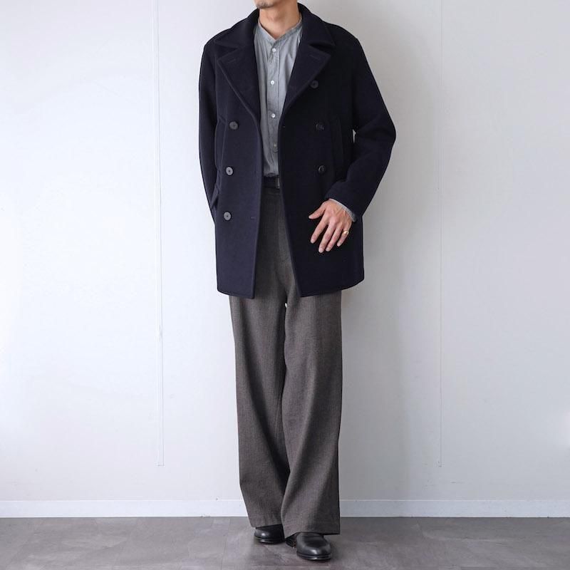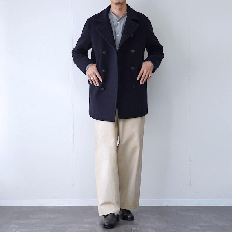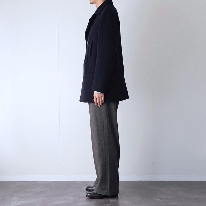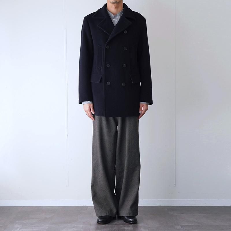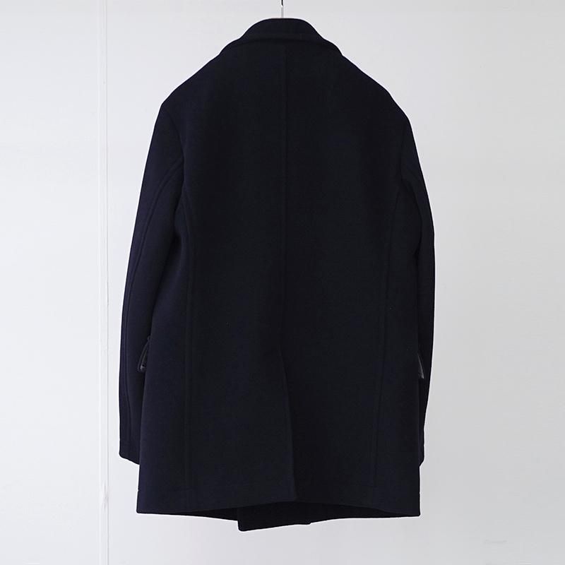 上質なウール100%のメルトン生地を使用し、密度の高い織りと滑らかなタッチが特徴。 厚手ながらも重さを感じさせないバランスで、着るほどに身体に馴染む仕立てです。 程よくボリュームを持たせた襟元に抑えの効いたシルエット。タイトな身幅で縦長のラインが特徴的。 オーセンティックなPコートをベースにしながらも、ラインの取り方や襟の角度、ポケットの配置まで緻密に整えられ、クラシックでありながら現代的な印象に仕上げられています。 伝統的なPコートの重厚さを保ちながらも、日常に馴染む軽やかさを感じさせる一着です。 モデル身長184cm 体重64kg 着用サイズ4 SIZE(cm) 3:着丈84 肩幅47 身幅54 袖丈63 4:着丈86 肩幅49 身幅57 袖丈64 QUALITY WOOL100% LINING:CUPRA100%