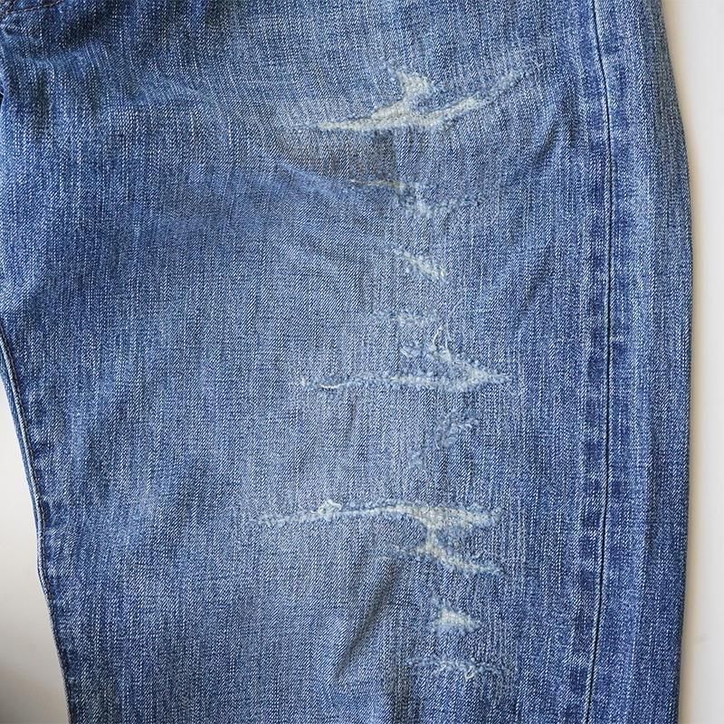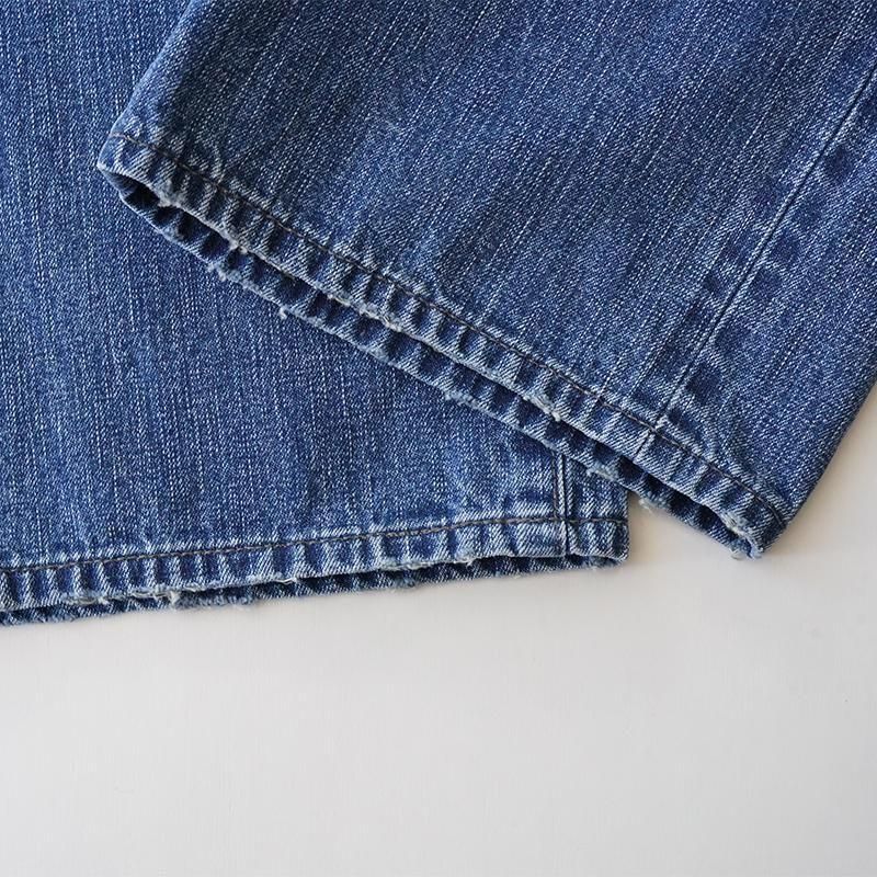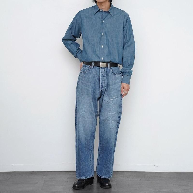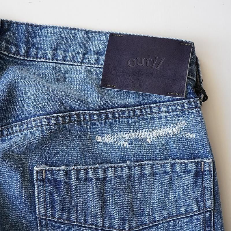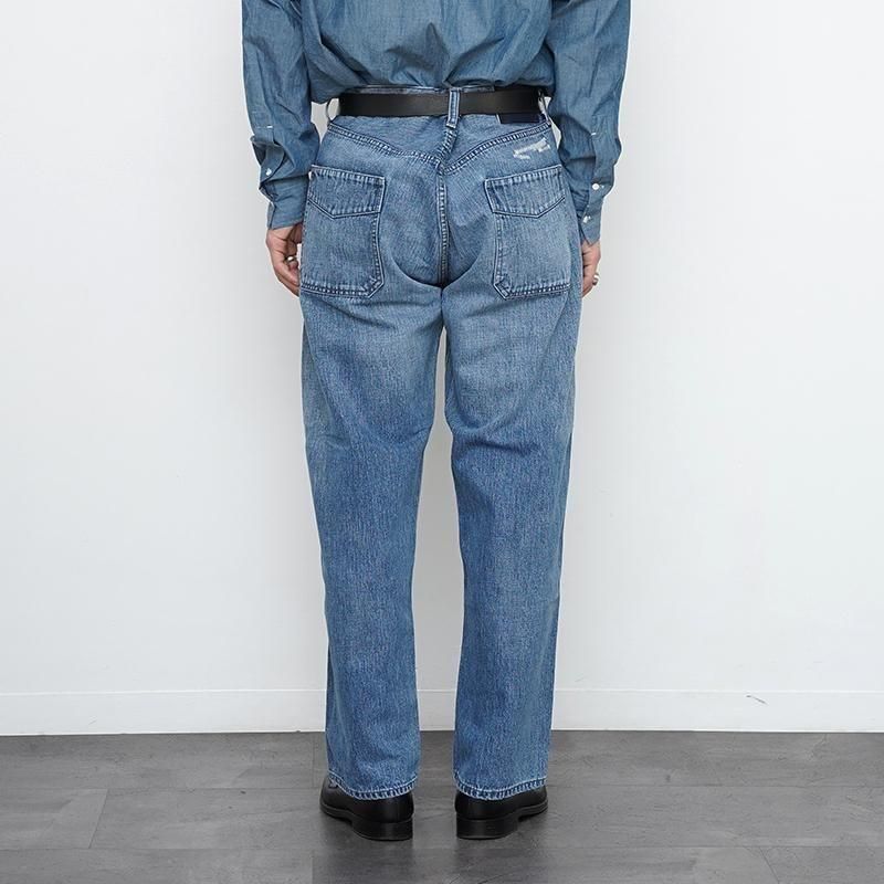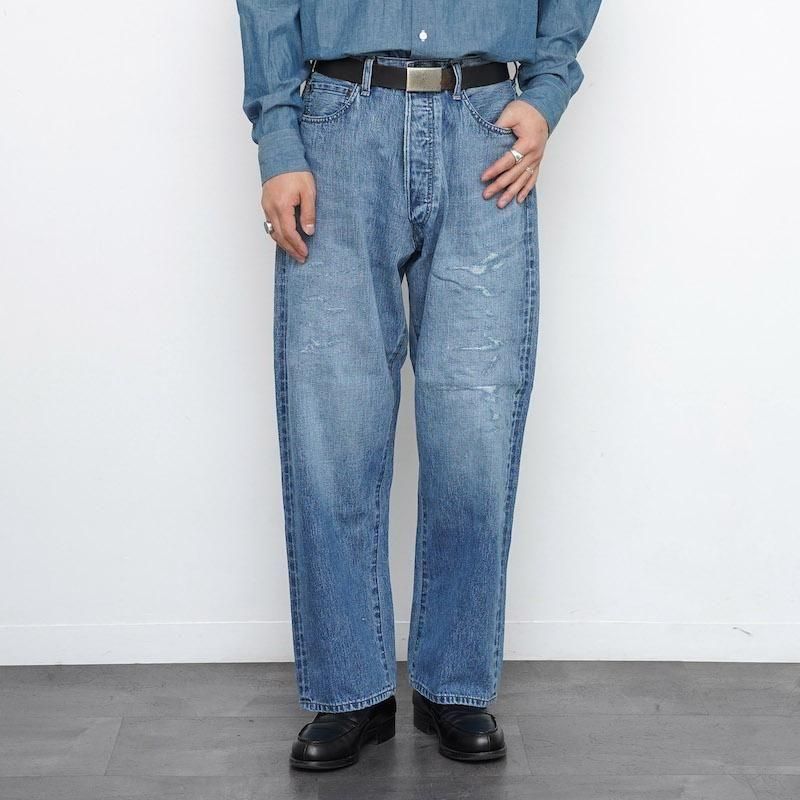 縦糸にロープ染色を施し、横糸にはヘンプとコットンの混紡糸を使用したオリジナルデニム生地に、リペア加工をプラス。ヴィンテージの風合いをさらに引き立て、穿き込んだような味わいを持たせています。 生地のドライなタッチとUSED感に、パッチやステッチで施された補修のディテールが重なり、個性のある表情に仕上がっています。 ベースとなるのは 1960sフランス製デニムパンツ。ルーズフィットで後ろ姿に程よいゆとりを残しつつ、前から見ても美しいラインを保っています。 フロントのボタンフライ、インディゴレザーパッチ、丁寧に形成されたバックポケットに加え、リペア加工ならではのステッチや補強パッチがデザインポイントに。古き良きワークウェアの雰囲気を生かしながら、現代的な味わいも楽しめます。 気負わず穿けるラフさと、どこか端正な佇まい。 素材・シルエット・ディテール・リペア加工が調和した、個性豊かな一本です。 モデル身長173cm 体重59kg 着用サイズ2 SIZE(cm) 1:ウエスト79 股上32 股下69 ワタリ34 裾幅22 2:ウエスト82 股上33 股下71 ワタリ35 裾幅22.5 3:ウエスト86 股上34 股下73 ワタリ36 裾幅23 QUALITY COTTON84% HEMP16% COW LEATHER